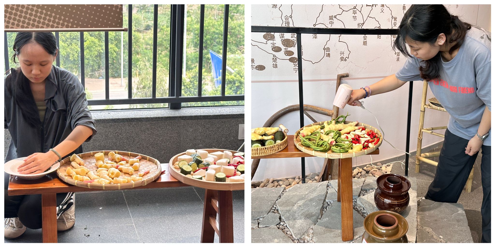 在三位教师的现场指导下,学生们精准完成食材预处理、盐水浓度把控等关键环节。经过1小时有序实操,6个贴有“巴渝队”“渝黔队”团队标签及制作时间的泡菜坛整齐陈列于展示台。此批泡菜将在非遗馆恒温恒湿环境下发酵7天,待后续该系列第三期活动开坛品鉴。