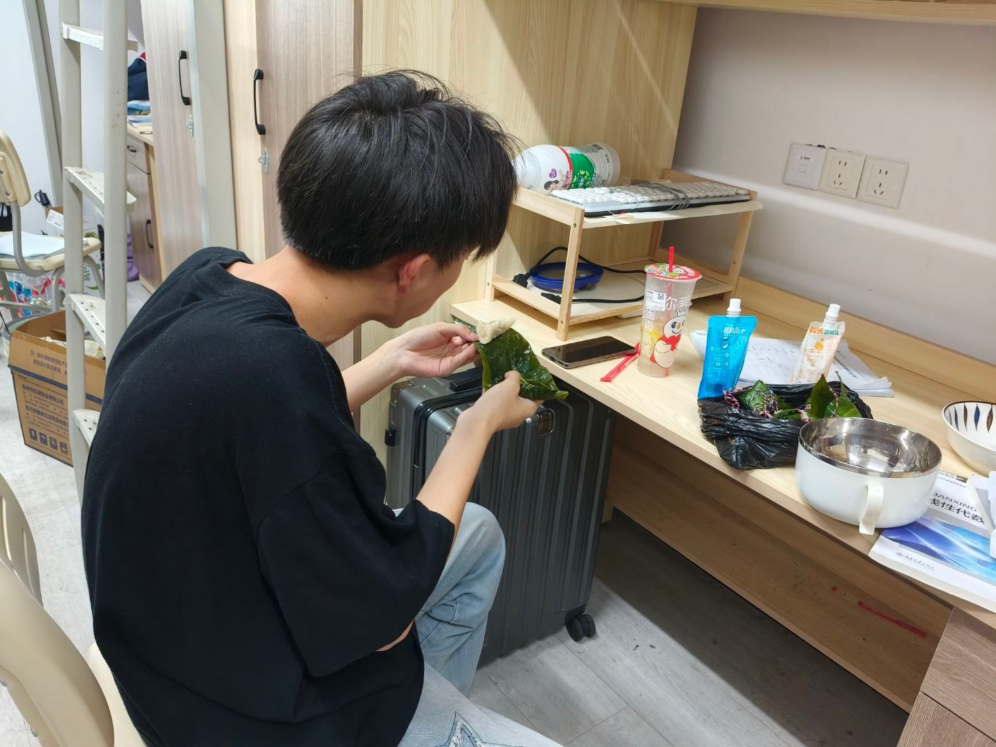 活动尾声,同学们并未独享这份劳动成果,而是将热腾腾的粽子带回寝室,与未能参与活动的班级同学分享。拆开棉绳、剥开粽叶的瞬间,香气在楼道中蔓延,吸引了许多好奇的同学围观。寝室里咬一口软糯咸香的肉粽,尝一勺清甜的红豆蜜枣粽,欢声笑语中,传统文化的温度通过食物传递到更多人心中。