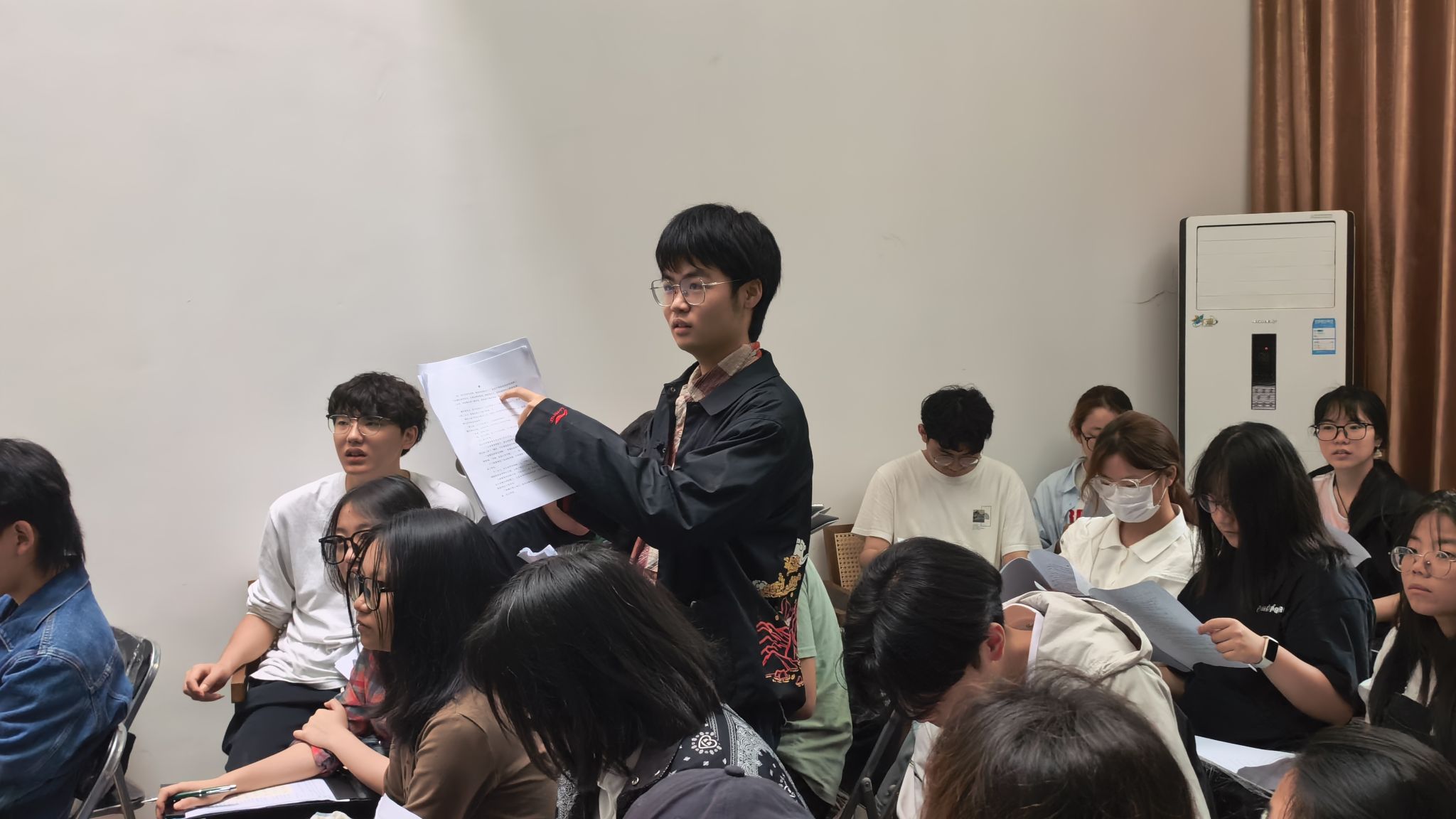 紧接着,非虚构工坊的王康力与谭先锋同学及小说工坊两位同学通过扮演两对吵架的夫妻,感受夫妻现实生活的“针锋相对”。先锋同学率先一句:“你怎么又在这里啰哩吧嗦?”一下子抓住了同学们的眼球。康力同学手指着先锋同学,一副咄咄逼人的样子引得大家连声叫好。两组同学的即兴发挥为大家带来了一场精彩绝伦的表演,他们的表演生动逼真,将夫妻间的矛盾与情感展现得淋漓尽致,将现场气氛推向了高潮。