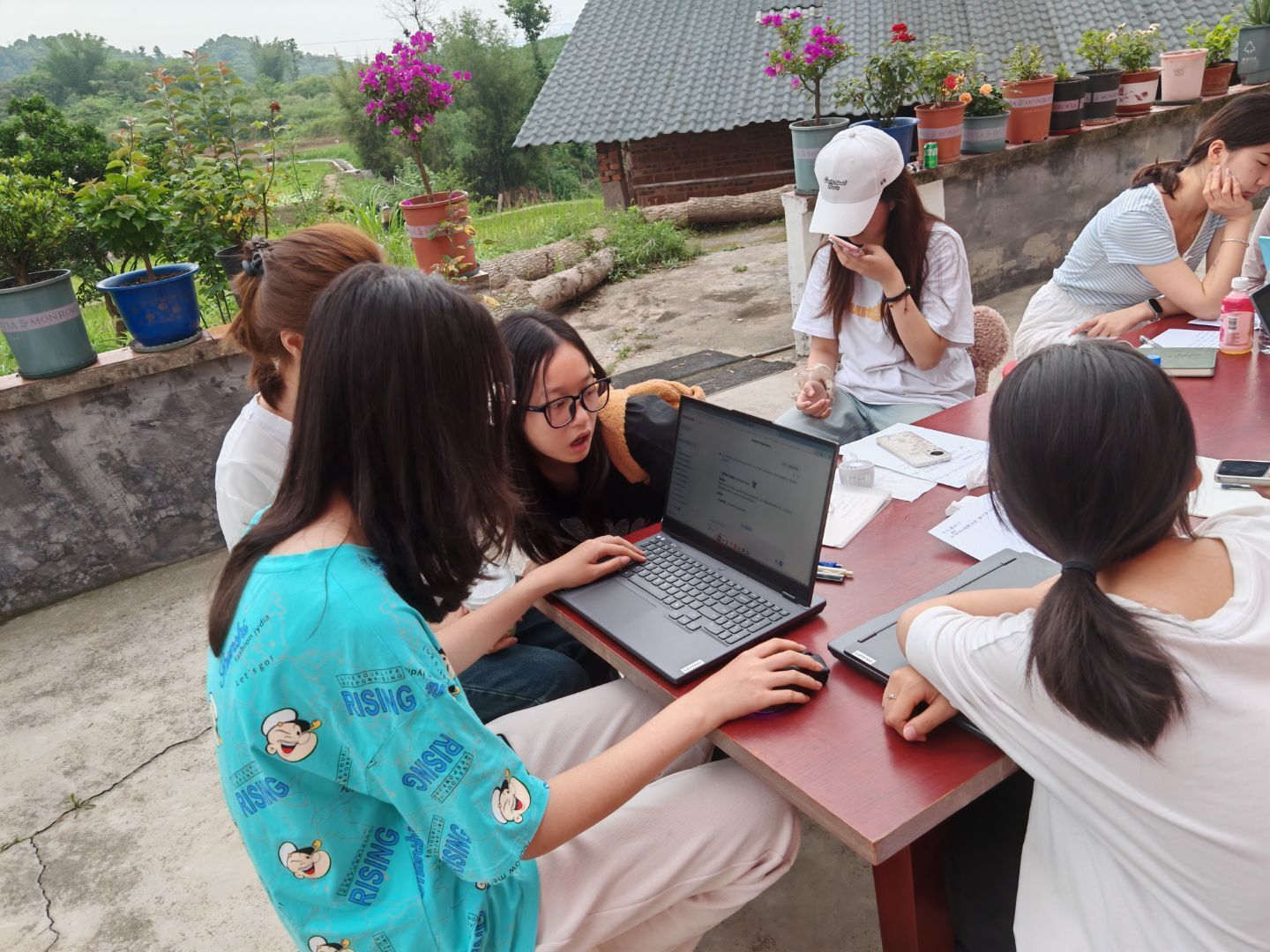 在实操环节,学生们两两一组,蹲在田埂上认真地输入剧本台词。“这里要加一个仰拍镜头,突出拖拉机的高大”“狐妖的眼神应该更哀怨一些”,讨论声中,技术不再是冰冷的代码,而是成为了实现创意的魔法棒。当第一个短片生成时,全体师生围坐在草地上,看着自己的文字变成动态的影像,眼中满是成就感。