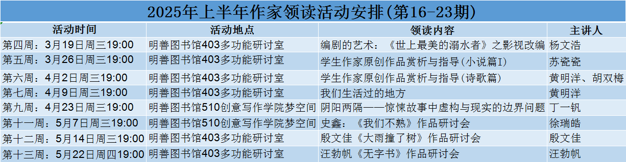 时光流转,弹指一挥间“作家领读”活动已悄然走过三个月的历程。活动期间,有对学生作家的作品赏析和指导,也有对教师作品的的解析,更不乏对经典作品的研读。师生共坐,齐聚一堂,老师们用幽默风趣的语言和不一样的思路分析作品,课堂充满了浓厚的学术氛围和积极的互动。学生们认真聆听彼此的创作思路,分享写作中的困惑与收获。苏瓷瓷院长和创意写作学院的老师们从主题立意、结构布局到语言表达,细致地分析每一篇作品的优点与不足,培养学生们的批判性思维和审美能力。