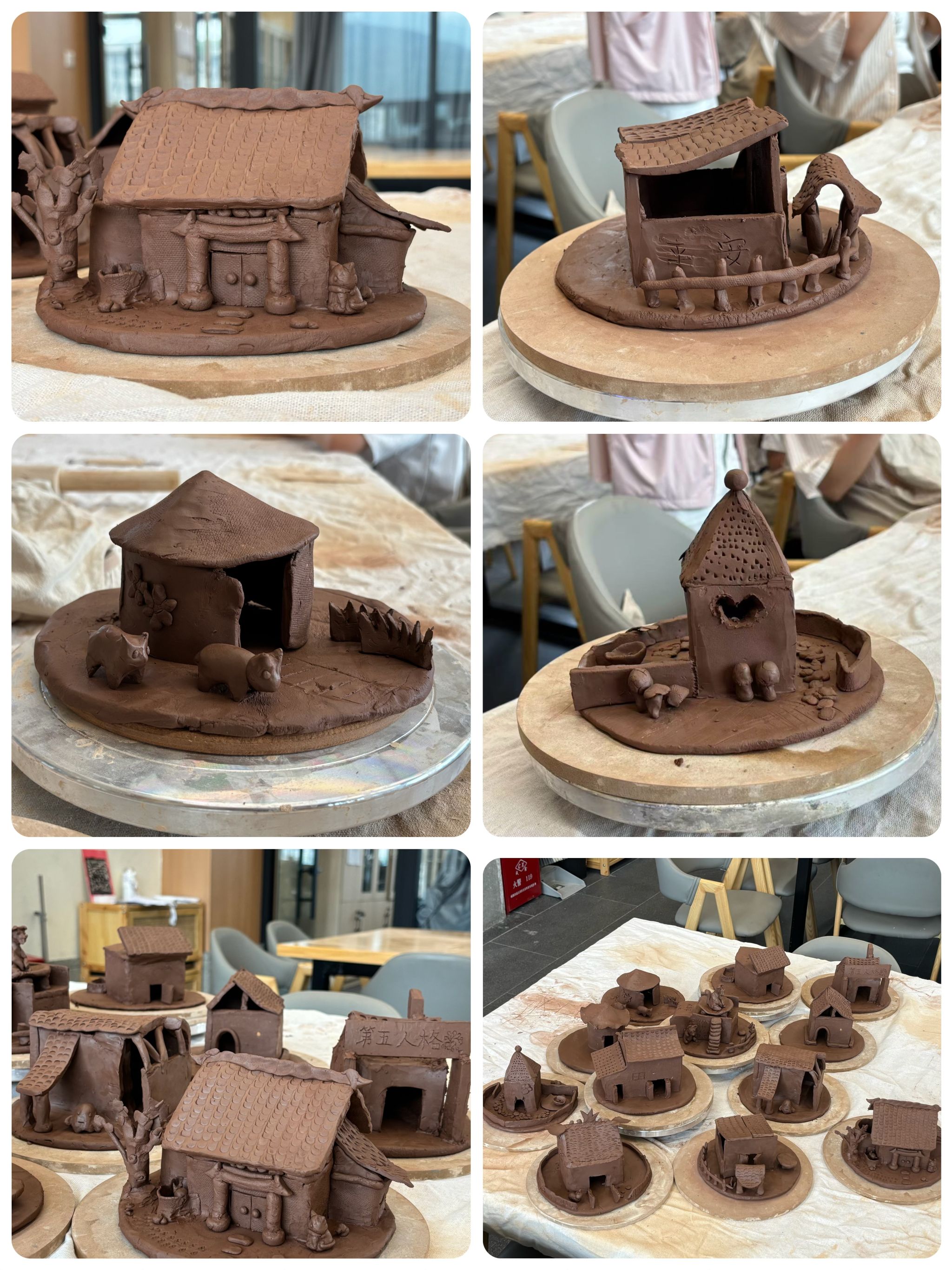 在两位老师的悉心指导下,同学们的作品创意百出。诞生的书院作品形态各异:有的似蒙古包,圆润古朴;有的还为书院增添了动物住所的设计,趣味横生;有的如坚固堡垒,雄伟庄重。同学们于陶艺创作中,不仅收获了独特作品,还获得了团队意识,更深化了对巴渝地区非遗传统文化的理解与热爱。