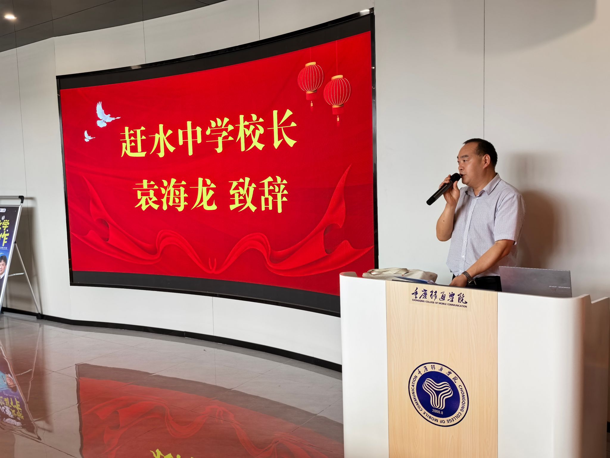 重庆移通学院副校长孙玺女士率先致辞。孙校长指出,教育的本质在于唤醒与点亮,而校际合作正是教育创新的生动实践。移通学院一直秉持特色人才培养模式,注重学生人文素养与创新能力的提升。此次与赶水中学的合作,将实现高校优质教育资源与中学基础教育优势的深度融合,为学生打开文学创作之门,激发创意潜能。她强调,移通学院将充分发挥自身优势,为赶水中学的同学们提供丰富多彩的文学讲座、创作功法以及组织写作实践活动,让大家在沉浸式学习中感受文学的魅力。
