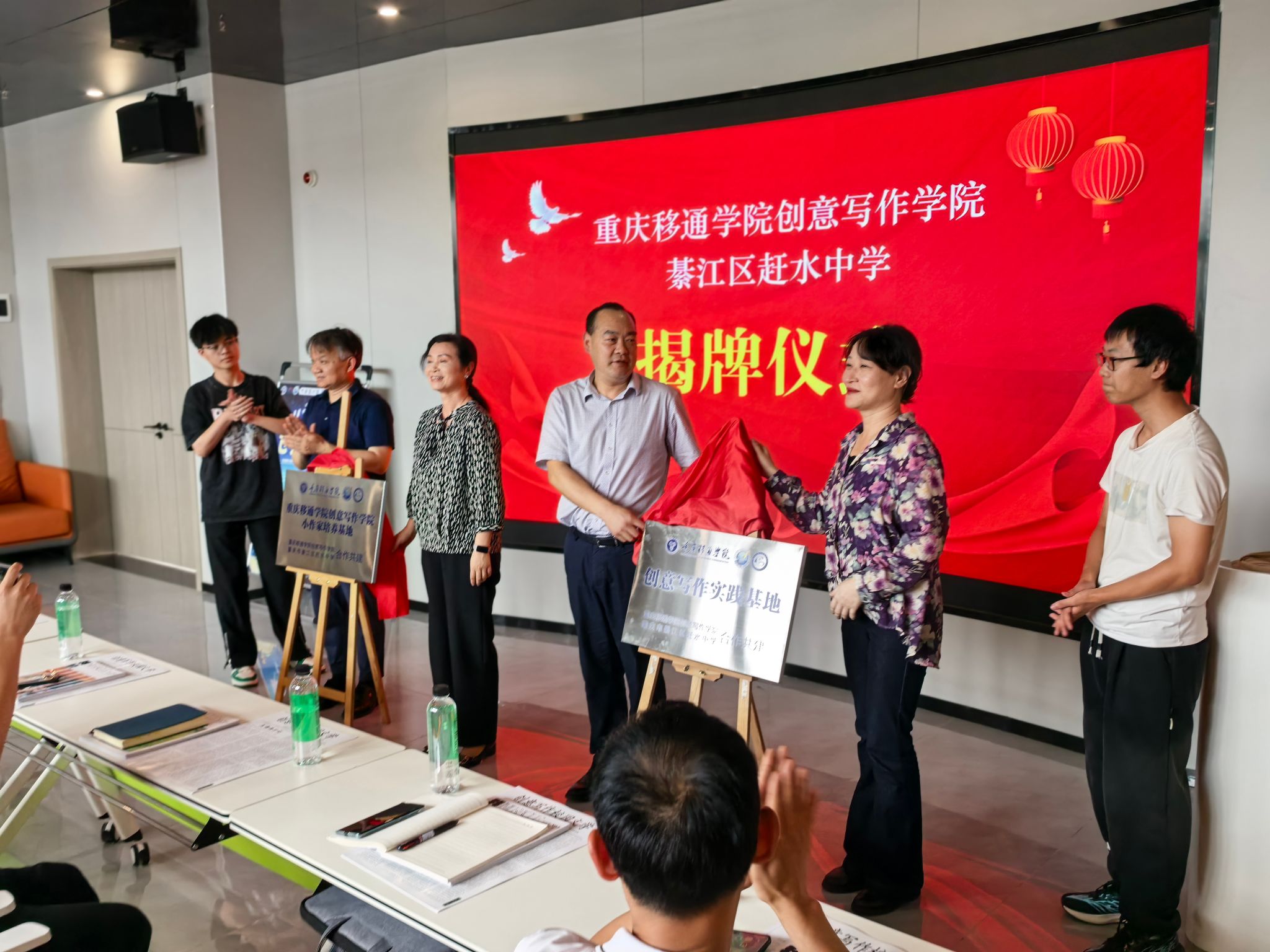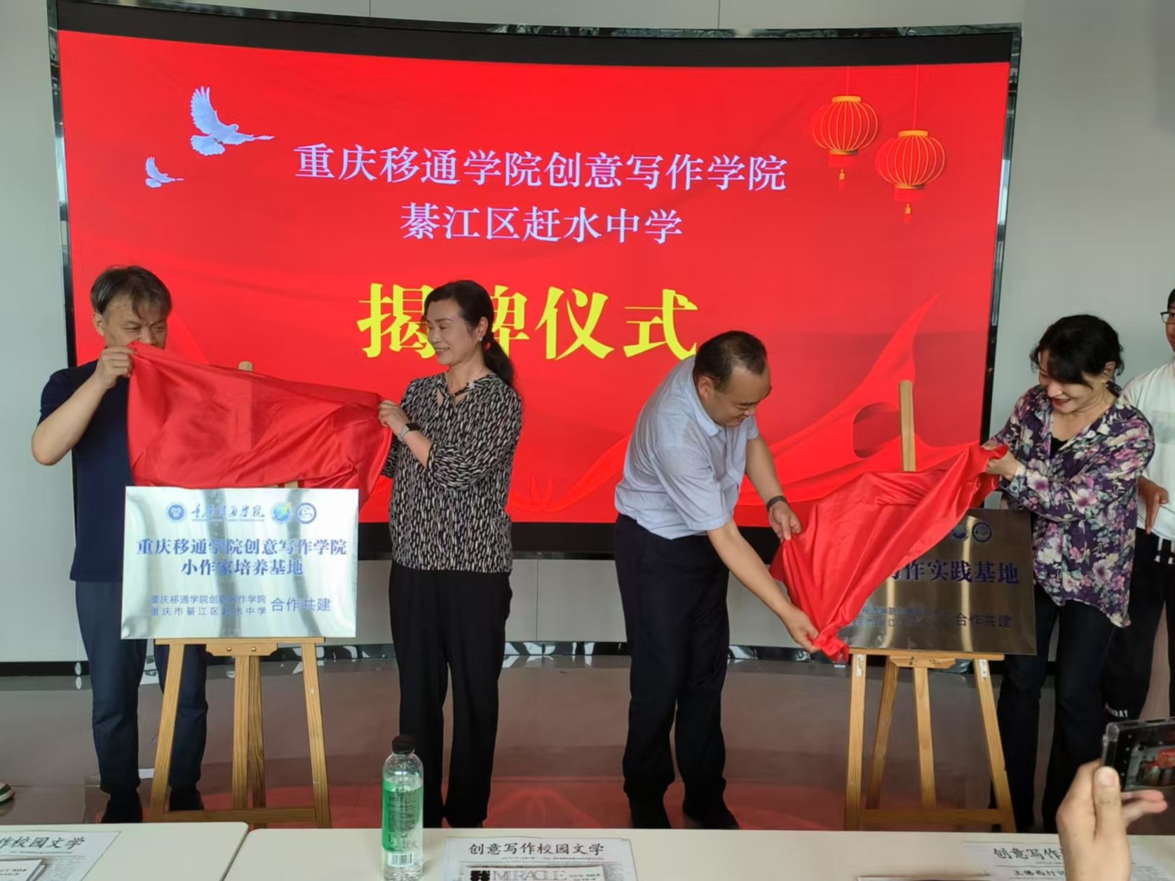 在众人期待的目光中,两所学校相互揭牌的仪式正式进行。孙玺副校长、袁海龙校长、谭旭东教授和苏瓷瓷女士共同登台,为“创意写作实践基地”与“重庆移通学院创意写作学院小作家培养基地”揭牌。随着红绸落下,两块牌匾正式亮相,象征着两校携手培育文学新苗的郑重承诺,标志着教育资源共享、优势互补的新篇章正式开启。
