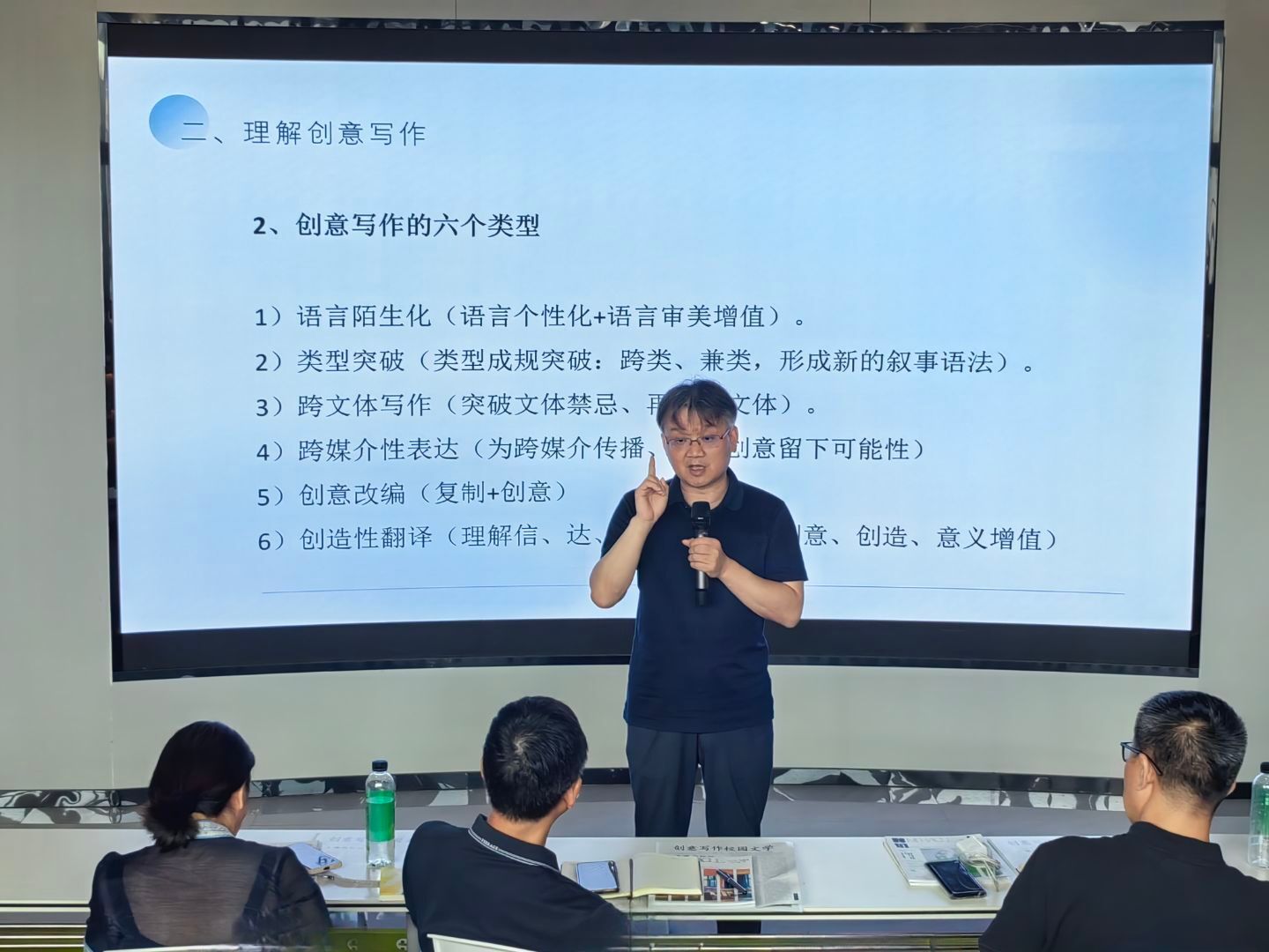 在谈到创意写作时,谭旭东教授更是妙语连珠。他指出,创意写作包含文学写作,是帮助写作者实现从大众写作到创意写作转变的关键途径。他鼓励同学们注重经典阅读,提升文字审美标准,坚持特定文体写作,以实现写作能力的进阶。谭教授还结合自身丰富的创作与研究经验,分享了创意写作的六种类型,包括语言陌生化、类型突破、跨文体写作、跨媒介性表达、创造性的翻译等,生动形象的讲解让同学们对创意写作有了更清晰的认识。谭教授在讲座中分享了许多有趣的趣事和经验。他讲述了自己的童年经历,如何在乡村的田野间找到了写作的灵感,以及如何通过阅读经典文学作品,逐渐培养了自己的文学素养。他还分享了自己在创作过程中的一些趣事,比如在创作一部儿童小说时,为了更好地理解儿童的心理,他经常与自己的孩子和学生交流,从中汲取灵感。谭教授强调,写作不仅需要天赋,更需要后天的努力和实践。他鼓励同学们多观察生活,多思考,多写作,只有这样才能不断提高自己的写作水平。