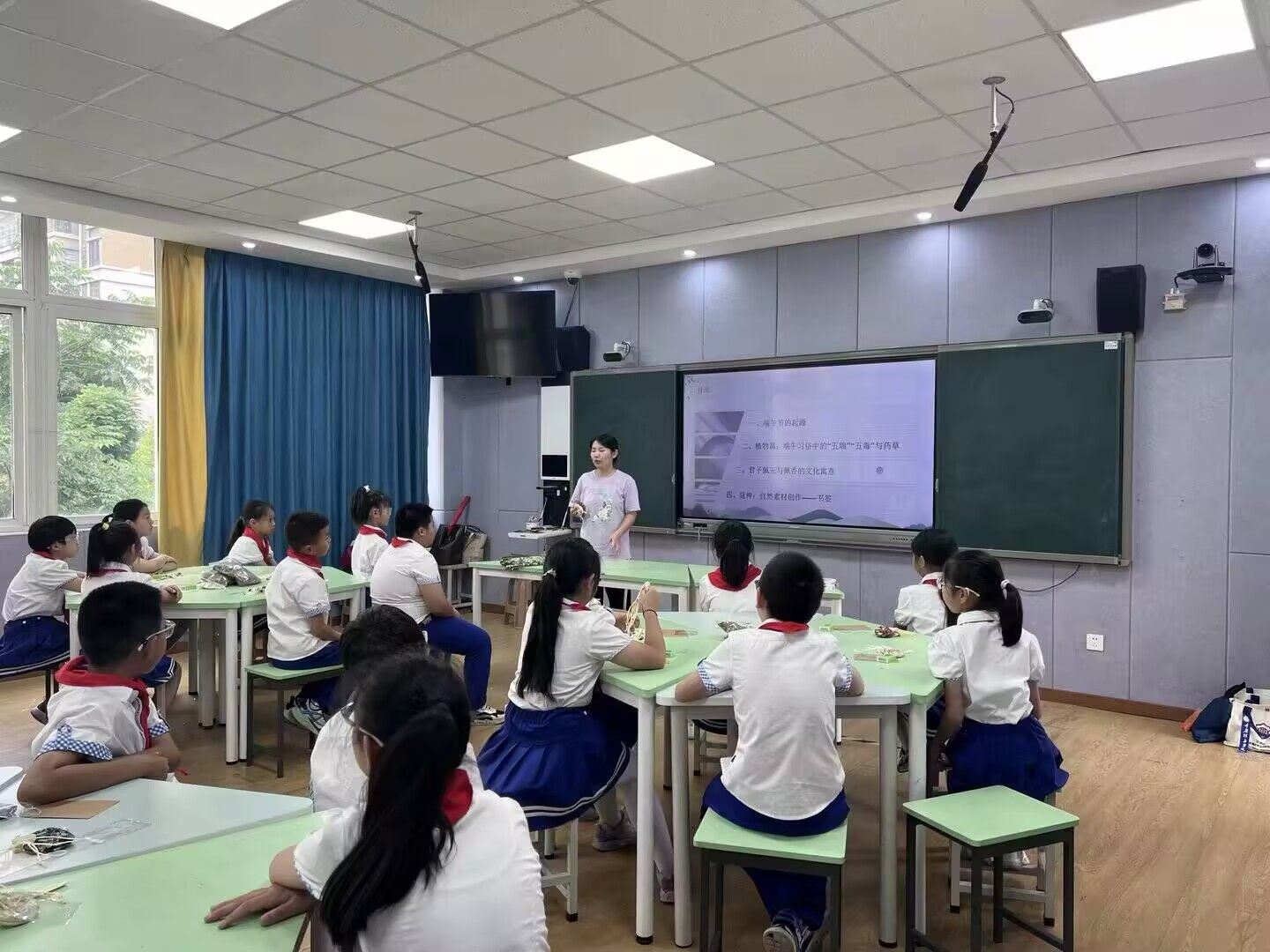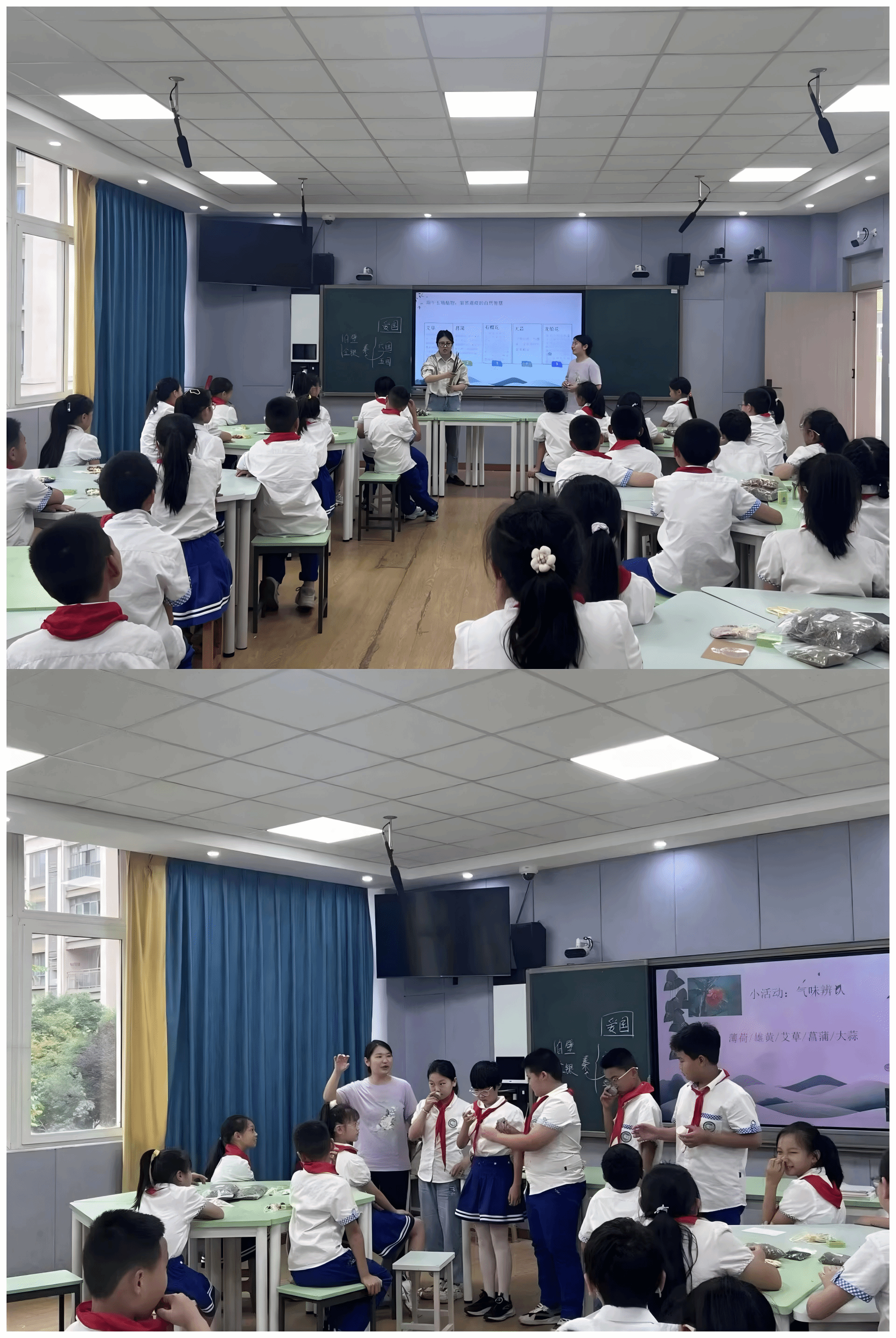 课堂首先以“端午溯源”拉开序幕,张老师通过视频向同学们详细讲解了端午节背后的故事,屈原的爱国精神深深触动了同学们的心灵。接着张老师通过图片展示“五毒”“五瑞”形象,讲解端午驱邪防虫的民俗逻辑,冯老师也向大家分享了菖蒲所代表的文人品格。随后,学生通过薄荷、雄黄、艾草、菖蒲、大蒜五种实物气味盒,在嗅觉挑战中辨认“五瑞”植物。辨认过程中孩子们的惊叹声此起彼伏,在趣味体验中理解古人“以自然之物驱邪避疫”的生存智慧。