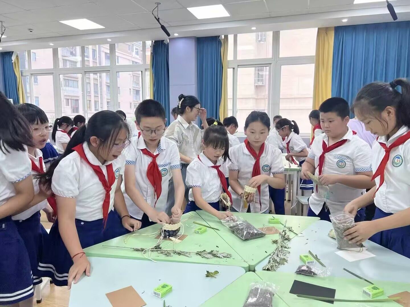 香囊制作成为全场最具活力的环节。张老师示范香囊制作的流程,每位老师负责6~7位同学的香囊制作。在此过程中同学们脑洞大开,还会让老师欣赏自己所做的香囊。接着,张老师又同步解读《离骚》中“扈江离与辟芷兮,纫秋兰以为佩”的文化寓意,让中医药知识与文学经典交织,孩子们佩戴自制香囊,在古韵书香中感受佩香示德的千年传承。