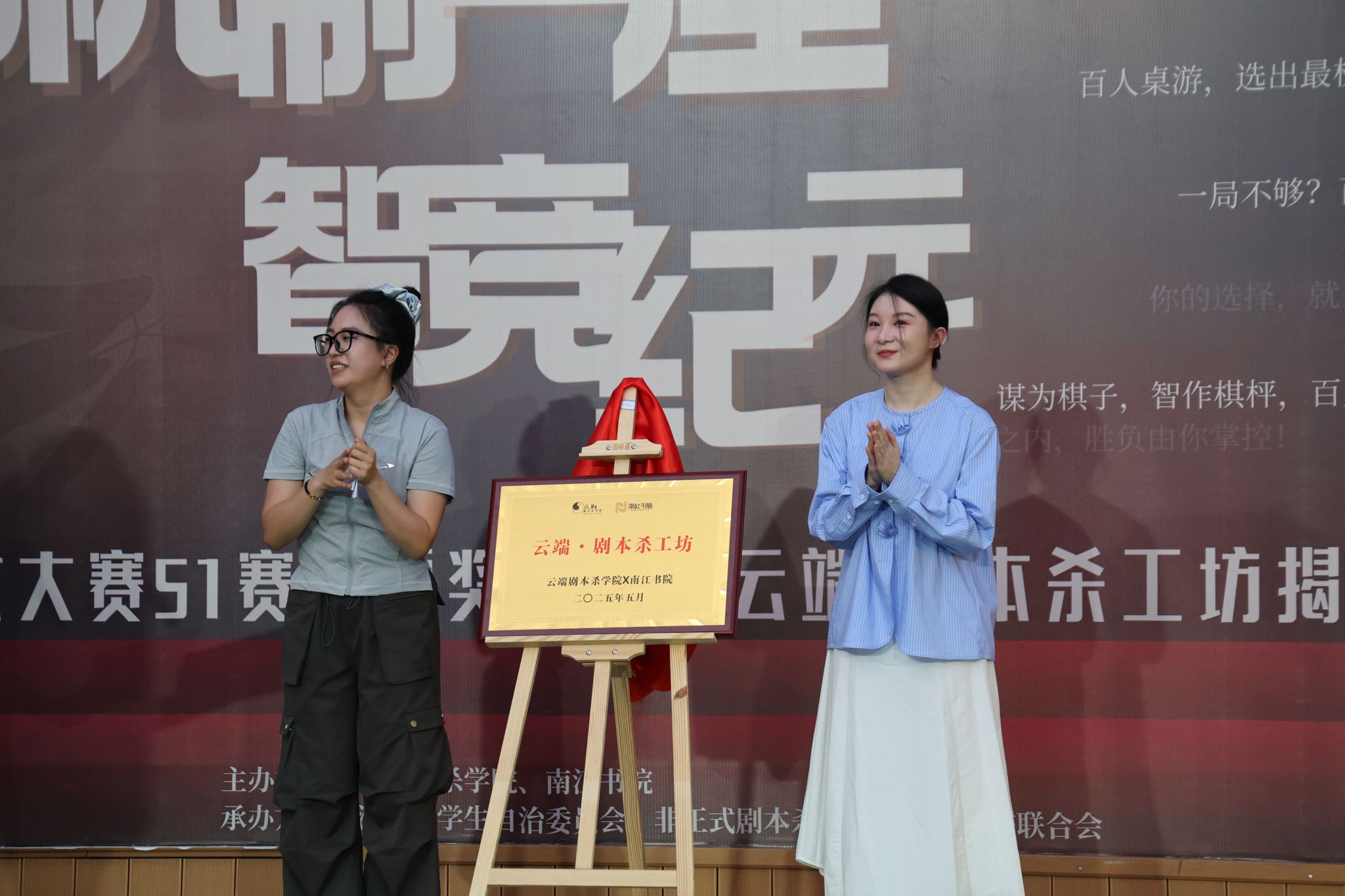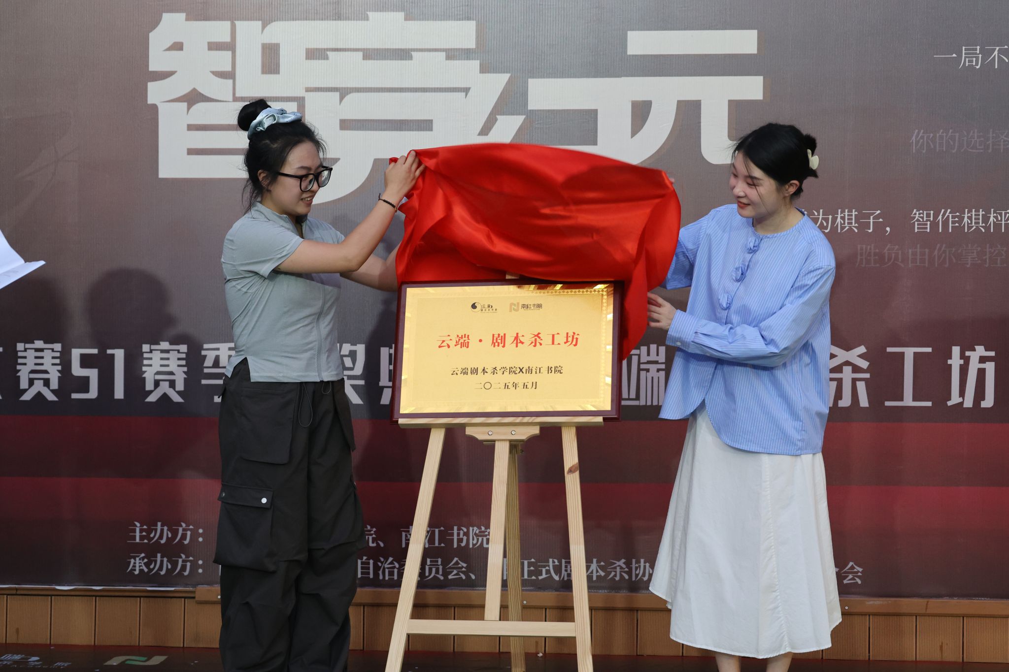 随后,云端剧本杀学院与南江书院进行“云端·剧本杀工坊”揭牌仪式,云端剧本杀学院负责人陈雪梅表示:“学院以剧本杀为媒介,训练学生的慎思明辨能力,与南江书院的领导力十分契合,希望通过此次工坊共建,依托书院平台,进行剧本杀兴趣培养和文化普及,打造更多集专业、兴趣于一体的,深受同学们喜爱的剧本杀活动。”