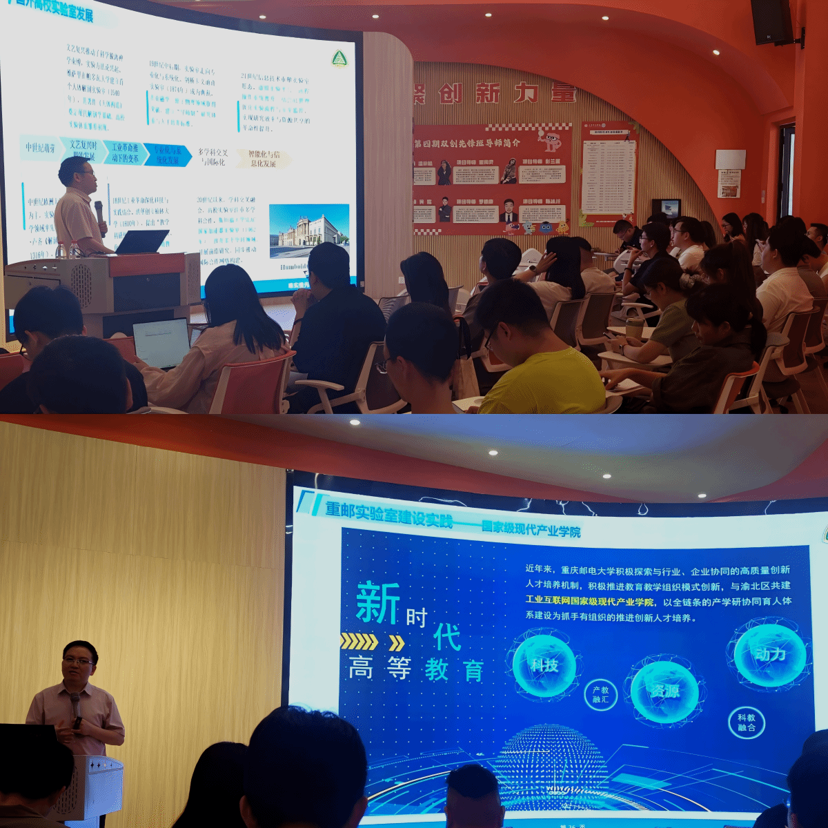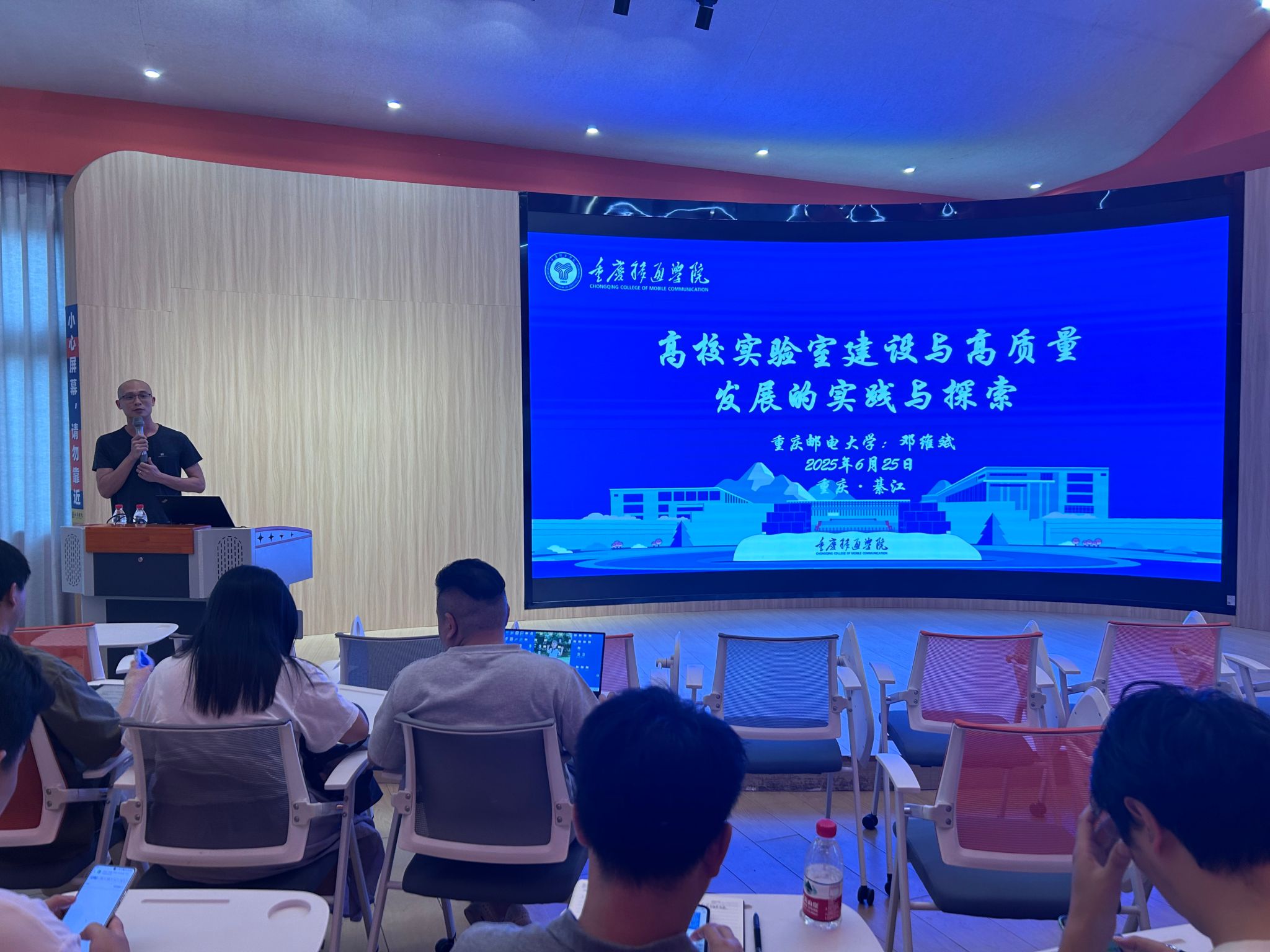 接着,由合川校区实验教学管理中心钟波副主任主持《高校实验室建设与高质量发展的实践与探索》主题培训,培训面向我校与实验室建设工作相关的教师。会议当中,邓维斌教授针对高校实验室起源与发展、实验室评价与建设、学科竞赛体系构建、实验室运行与管理等内容进行了分享。结合重邮实践,他详细介绍了国家级移动通信示范中心、市级经济管理实验中心等案例,包括其构建的“两维度三层次”实践教学体系、实践能力达标测评体系等创新机制。强调了虚拟仿真技术的深度应用,如建设国家级虚拟仿真实验教学中心、开发“红色通信”等特色虚拟仿真项目、打造“新一代信息通信技术实践教学平台”(入选重庆市首批产教融合虚实一体化平台),有效拓展了实验教学的深度和广度,并实现优质资源的开放共享。同时,他也分享了AI赋能实验教学模式创新、以及运用智慧平台(如实验室危化品管理及巡检平台)提升安全管理效能等经验,为高校实验室的现代化建设和高质量发展提供了系统方案。