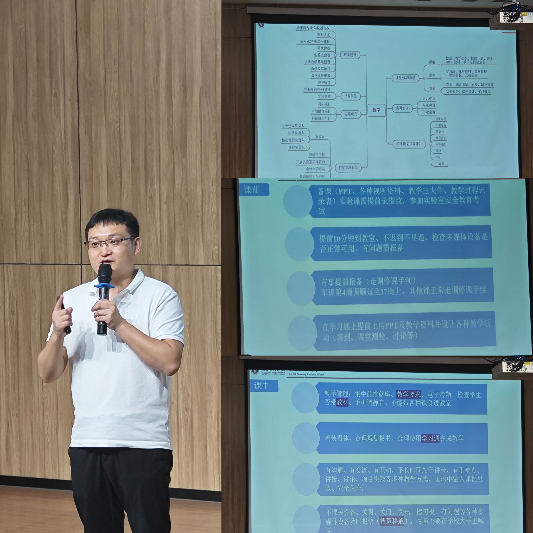 为进一步提升数字经济商学院教学能力和人才培养质量,筑牢高素质商科领域人才培养根基,数字经济商学院于2025年9月3日下午17:00在贤者楼131多功能报告厅召开期初教师教学规范与教学能力提升培训会。本次会议由数字经济商学院教学副院长王哲主讲,全体教职工参加,共同为新学期教学工作蓄能充电。