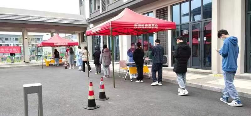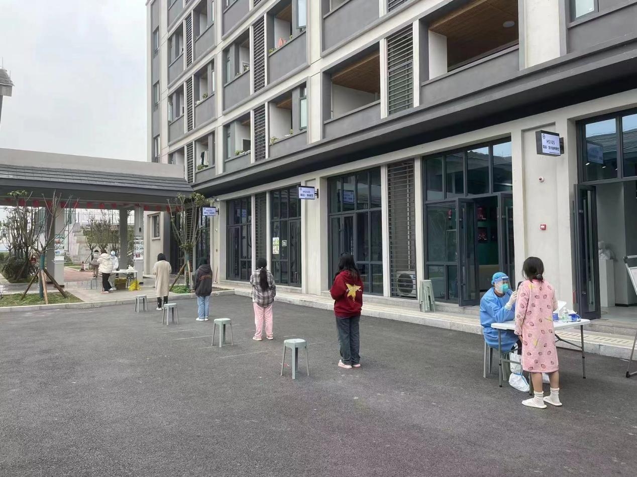 每天设立核酸采样点,协调核酸采集单位,以楼栋为一个点位,按楼层为单位,一个宿舍为一队,通知学生依次下楼做核酸采集,确保不漏掉任何一位学生。采集结束后,及时核对楼栋人数和核酸采集后台人数,再次确保无一人漏采。学校给每个宿舍配备一个体温计,每天三次测量体温,降低突发情况出现的风险。