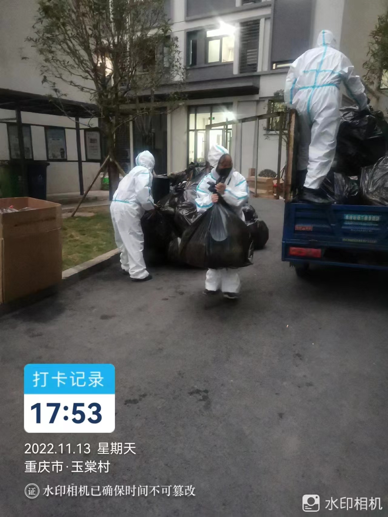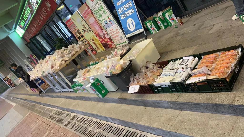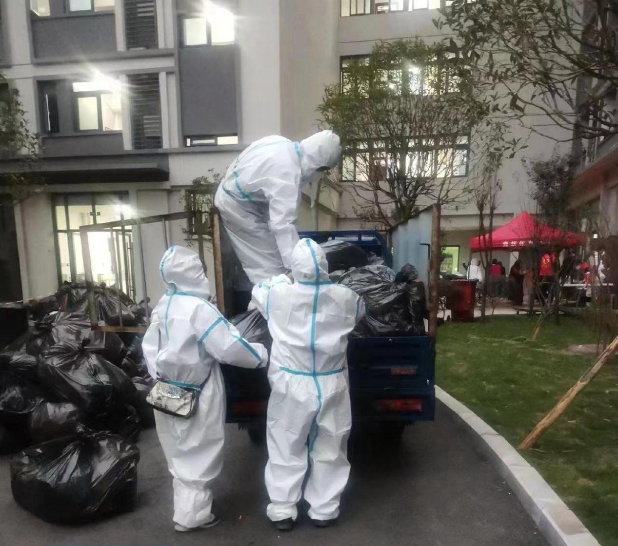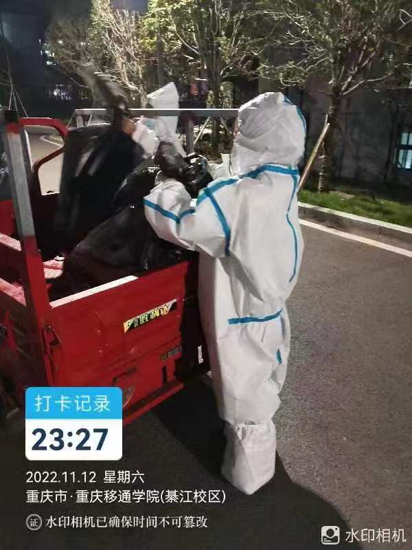 封寝期间,学校在特定时间期间每栋楼下安排了保洁人员。在学生下楼做核酸时,可携带上餐食打包和平常生活产生的垃圾扔掉。骤增的垃圾数量并没有影响保洁人员的工作质量,在所有同学做完核酸后,同学们们这一天的垃圾也扔完了。保洁人员会将同学们扔掉的垃圾进行封袋打包后,扔进垃圾车里,并进行消杀。
