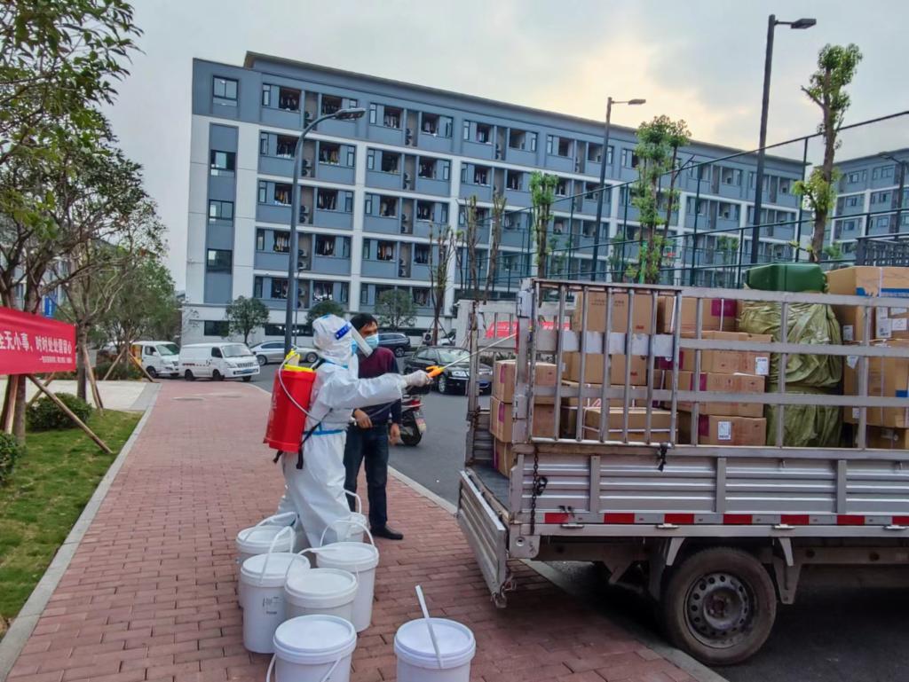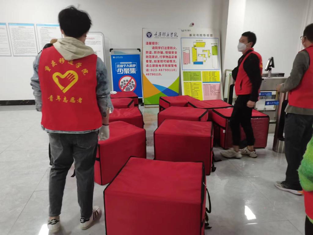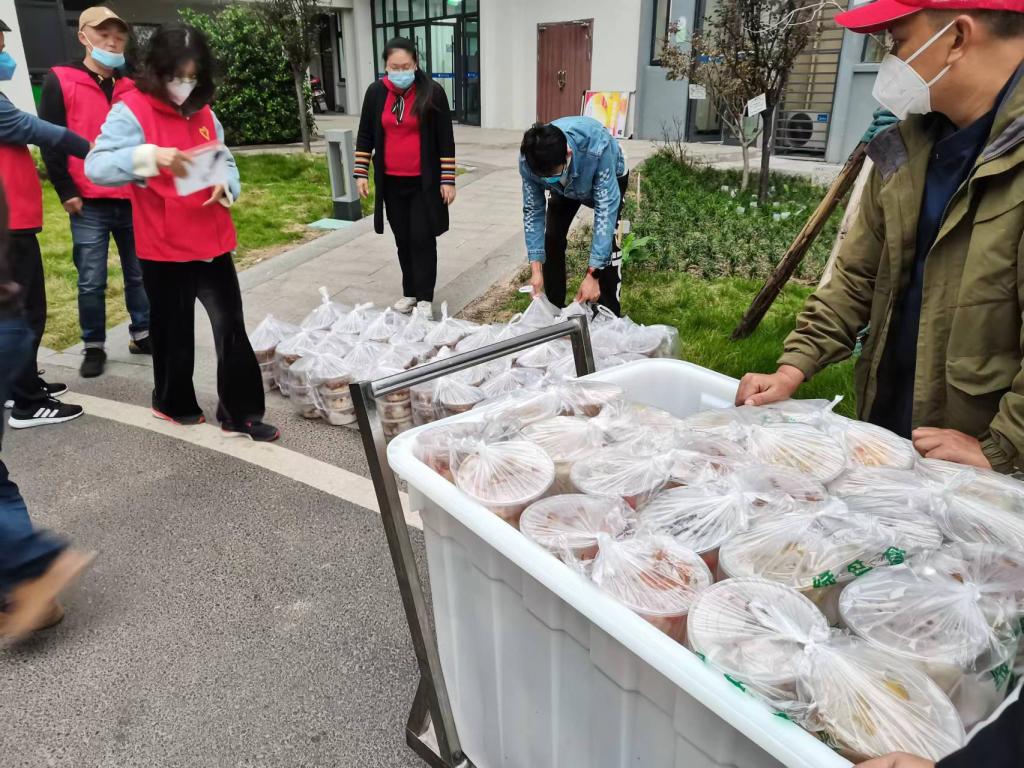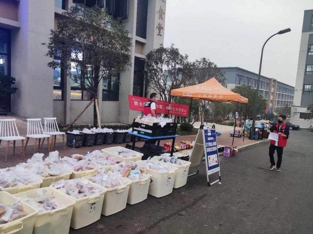 根据全校师生用餐需求,后勤保障组统筹联系两个校外餐饮公司和超市,组建7个楼栋联络员对接每栋楼的楼长,保证每一个人一天都能吃上三餐。6:00-9:00配送早餐,10:30-14:00配送午餐,16:30--19:00配送晚餐。他们要负责配送师生8栋楼,八千多份餐食。面对楼层配送,他们分化区域,来回拿餐直接配送;面对高楼层配送,他们在楼梯间的接力运输上去所有的餐后,再分化区域送餐。疫情来临,他们保证了学校每个人都能吃上热腾腾的饭。