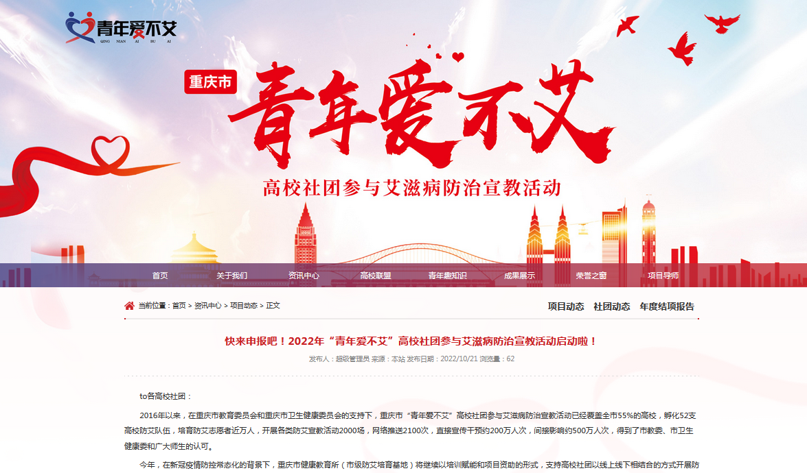 据了解,重庆市“青年爱不艾”高校社团参与防艾宣教活动是在重庆卫生健康委员会和重庆市教委的支持下,由重庆市健康教育所(市级防艾培育基地)以资助项目的形式支持高校社团开展的艾滋病宣传教育活动。