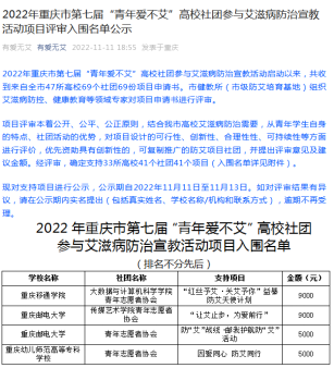 日前,我校大数据与计算机科学学院“红丝予艾 关艾予你”益綦防艾天使计划经过了前期自主申报、初审、复审以及公示等环节,现已成功入围2022年重庆市第七届“青年爱不艾”高校社团参与艾滋病防治宣教活动项目,获得资助资金9000元。
