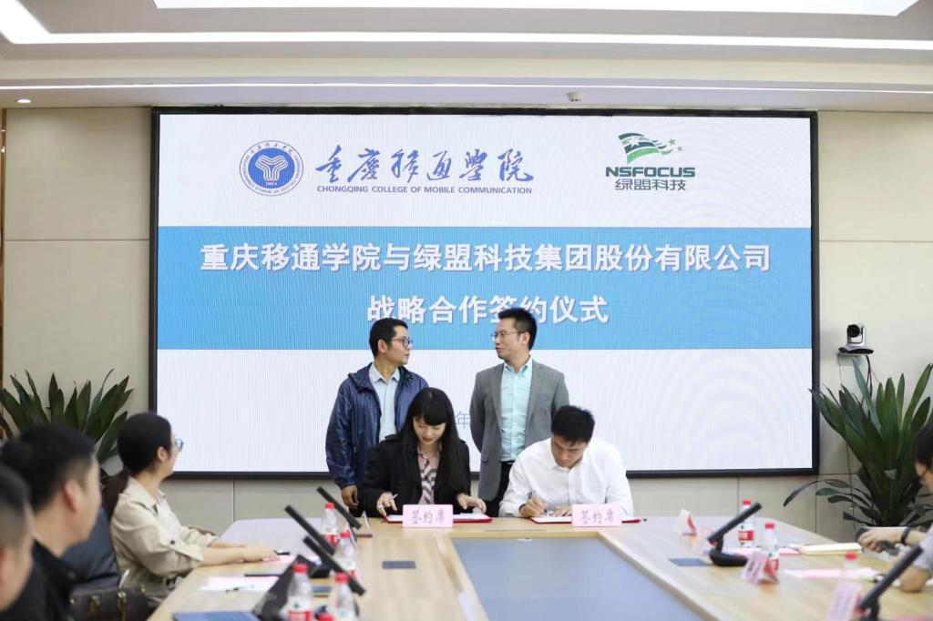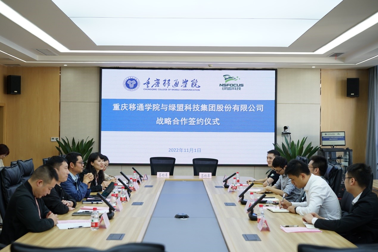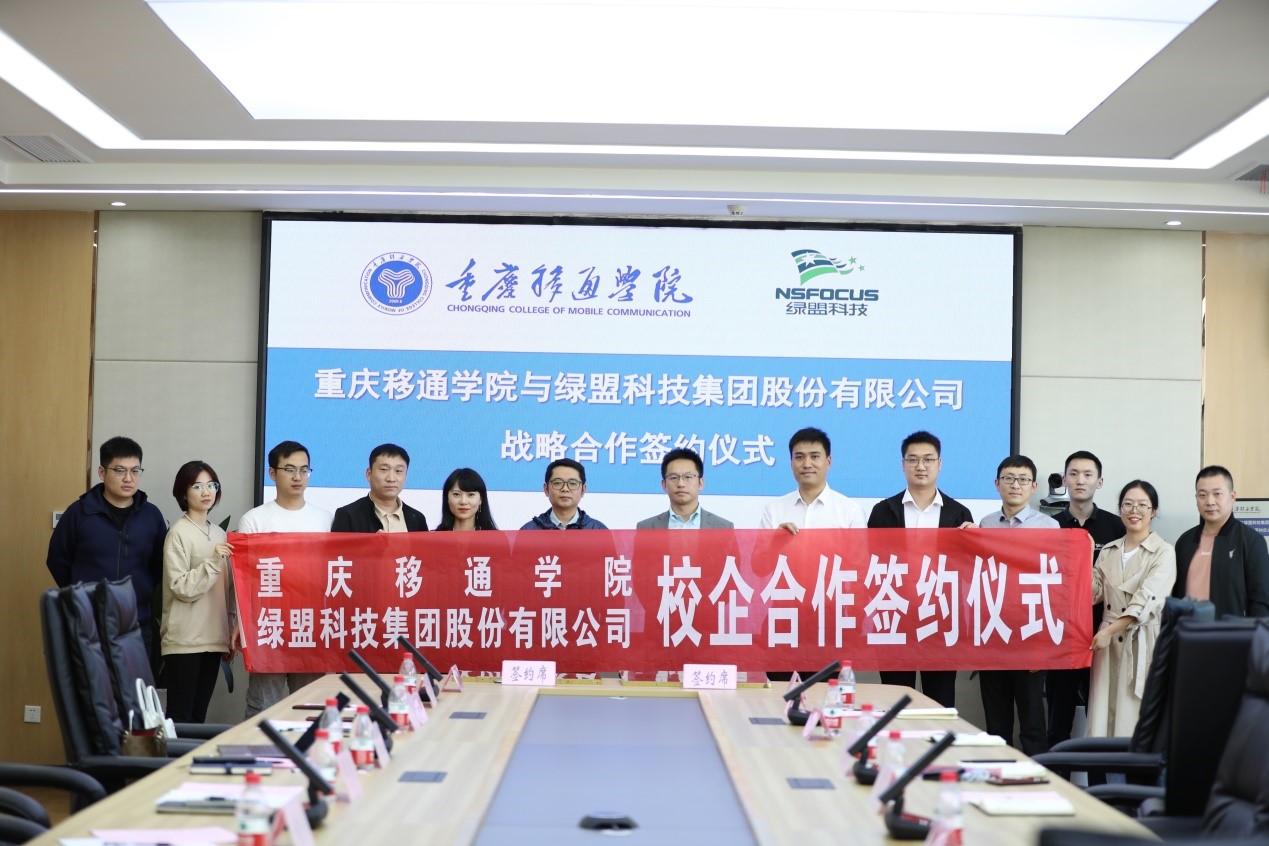 为实现产学研用融合发展,拓展校企合作新领域,共建校企协同育人机制。2022年11月1日,重庆移通学院与绿盟科技集团在重庆移通学院綦江校区第一会议室举行校企合作签约授牌仪式。重庆移通学院常务副校长王永周、信息安全学院院长王宁、学工办主任邹健、信息安全负责人周小艳、软件工程负责人黄兴,绿盟科技集团首席代表陈果、行业总监王腾飞、技术总监冉靖、行业代表黄粤杨、安全顾问晏健晨等出席此次签约授牌仪式。