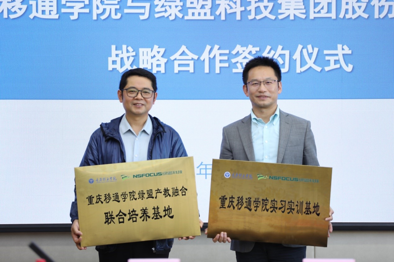 在双方代表深度交流之后,在重庆移通学院王永周校长和绿盟科技集团首席代表陈总的见证下,校方代表王宁院长和企业代表王腾飞总监郑重签下校企合作协议,随后校企双方进行了授牌仪式。