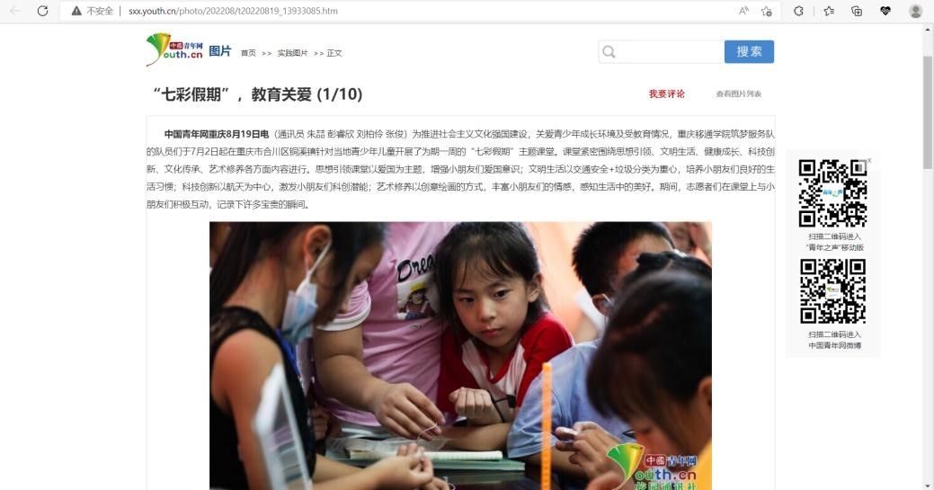 我校筑梦服务队于7月入驻合川区铜溪镇铜溪社区开展志愿服务活动。由19位成员紧跟团中央指示利用自身专业知识结合小朋友特点开展系列活动,用行动践行志愿服务精神。活动期间开展“七彩假期”主题课堂7期,团队累计志愿时长500余小时,共受益人数600余人次,投放相关稿件到校内外媒体宣传平台共计40余次,累计阅读量上万次,其中不乏中国青年网、中国新闻网、重庆共青团、中国公益报道等国家级、省市级媒体平台。