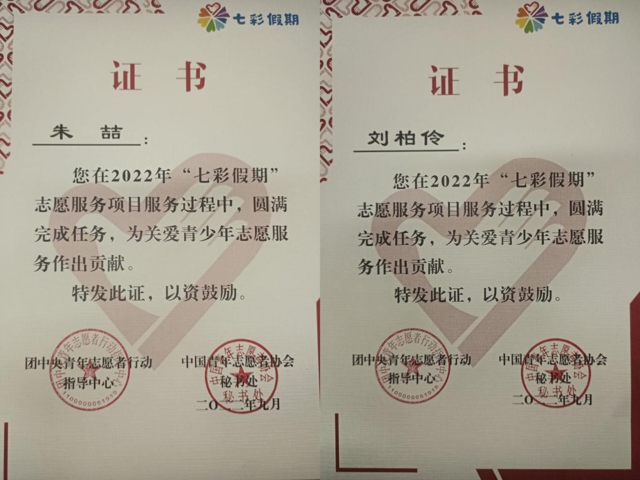 “您在2022年‘七彩假期’志愿服务项目服务过程中,圆满完成任务,为关爱青少年志愿服务作出贡献,特发此证,以资鼓励。”