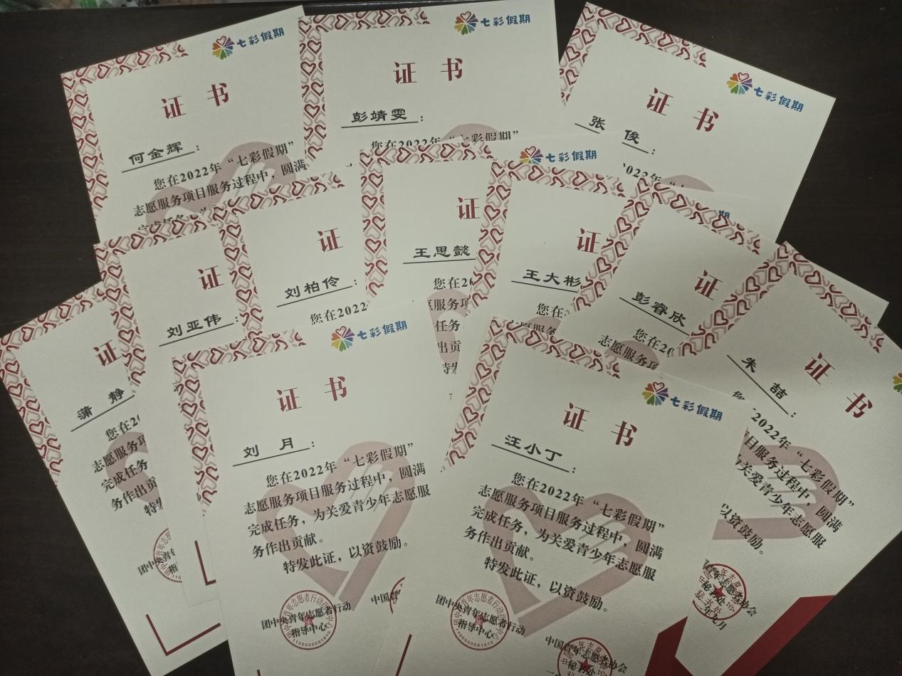 近日,我校筑梦服务队19位成员已全部收到由团中央青年志愿者行动指导中心和中国青年志愿者协会秘书处联合发布的2022年“七彩假期”志愿服务项目表彰证书,一张张证书充分证明了团队成员为关爱青少年志愿服务作出的突出贡献。