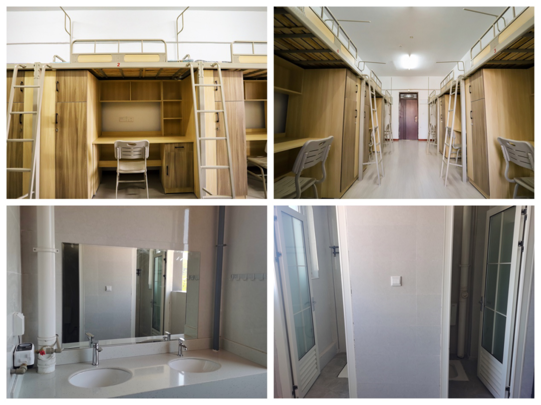 宿舍拥有独立阳台、双卫生间(含淋浴间)、一个洗漱台(两个洗手池)、精装木地板,配备智能热水系统、空调、网口。