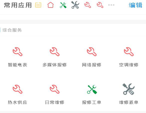 登陆成功后在常用应用里面找到综合服务栏,有智能电表、多媒体报修、网络报修、空调报修、热水供应、日常维修等六个报修选项,选择相应的报修项进行填写报修。如图:
