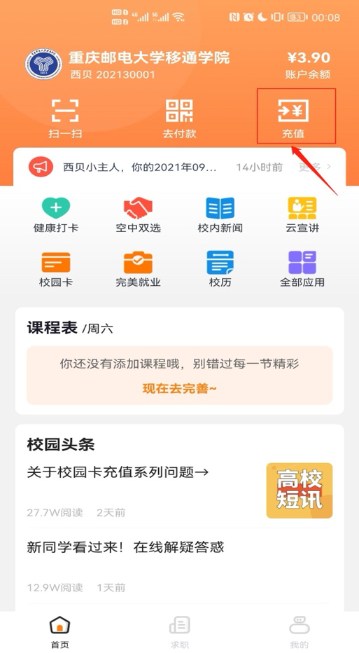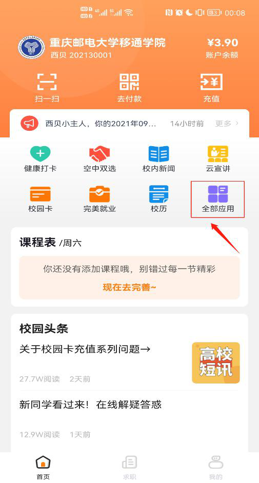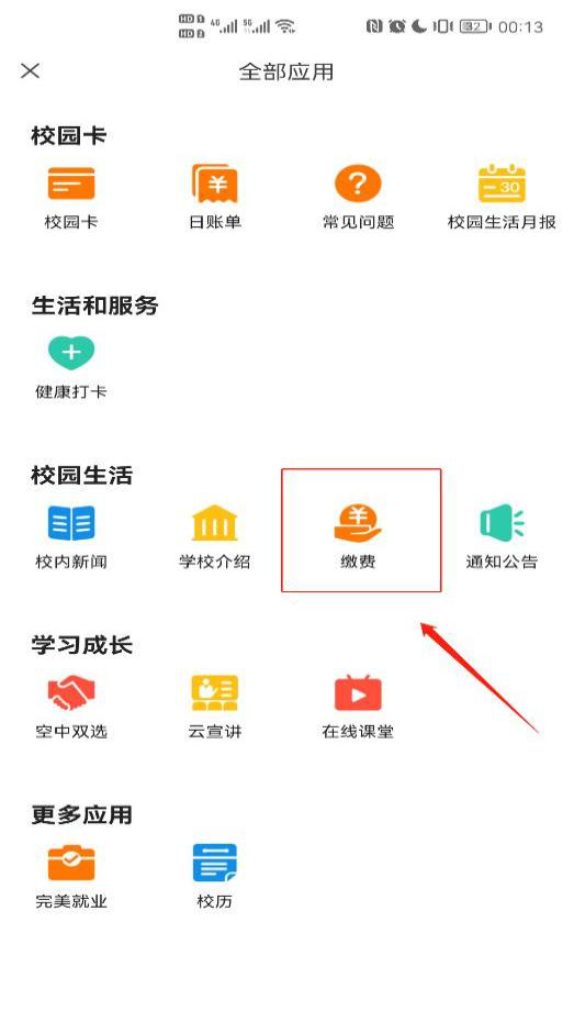 (1)宿舍用电费缴费:点击“全部应用”—“缴费”—“用电支出”—进入 “云缴费”(选择正确的房间、输入充值金额、立即支付)