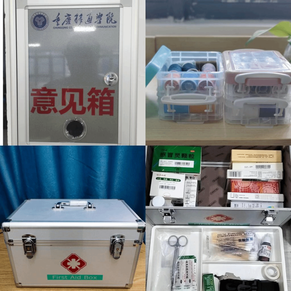 公寓值班室还配有同学们日常所需的针线盒、医药箱。当衣物不小心破损时,可在值班室找值班老师借用针线盒缝补衣物,如果暂时不会这项技能,值班老师也很乐意为各位同学提供帮助。医药箱里备有纱布、创口贴、消毒酒精、医用胶带、布洛芬、感冒药、腹泻药、云南白药气雾剂、阿司匹林、消毒液、红药水等医用物品供同学们借用。
