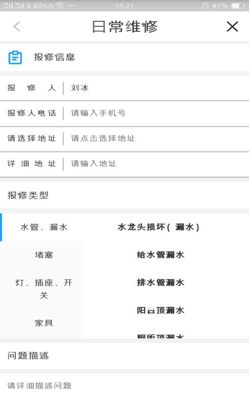 报修需要准确选择报修类别,若报错维修类别就无法准确派单给相应维修师傅,填写报修信息需把姓名、电话号码、详细地址 、故障现象准确描述出来附加故障图片提交报修。如图: