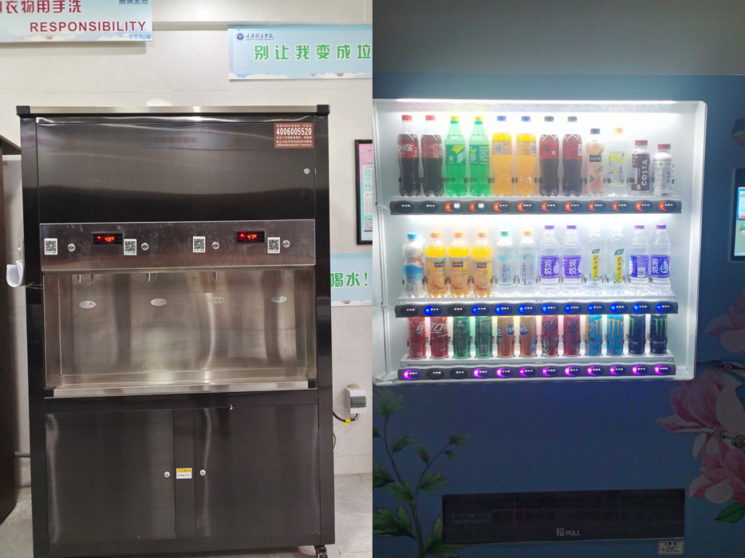 每栋公寓楼内均设有洗衣机、烘干机、洗鞋机、自动售卖机、直饮水机,以上设施设备会有专人进行定期清洗、消毒和维护保养,同学们可通过扫描机器上二维码放心使用。