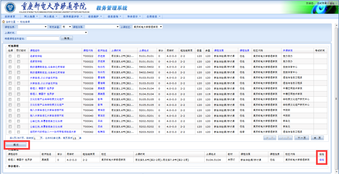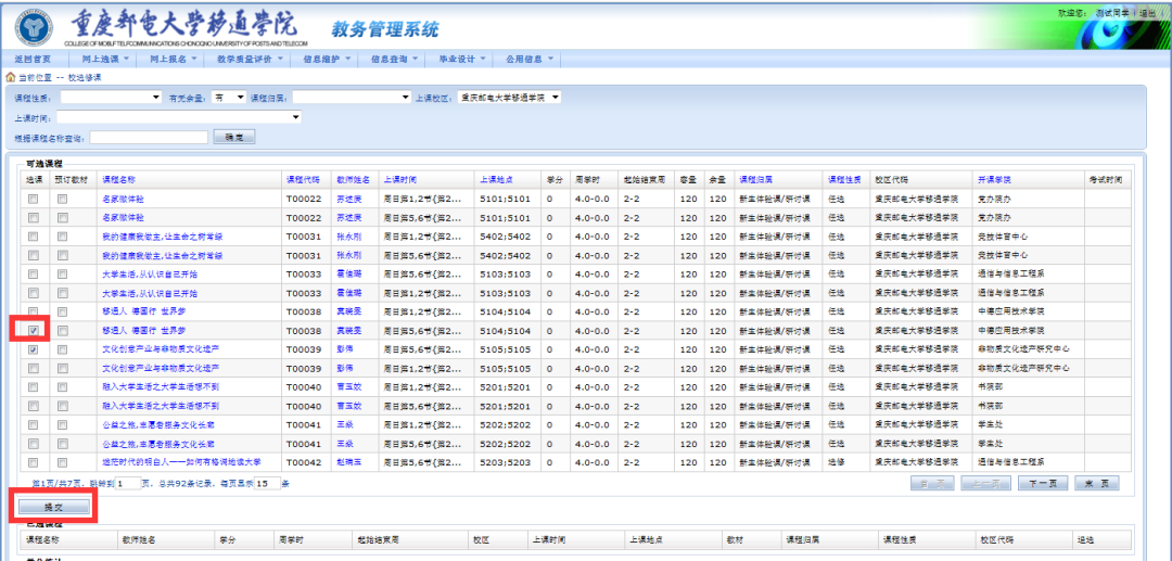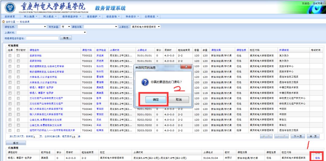 7. 下面有自己已选课程的列表,确认是否选择正确。如果发现自己选错了,后面有“退选”按钮,可以退课。