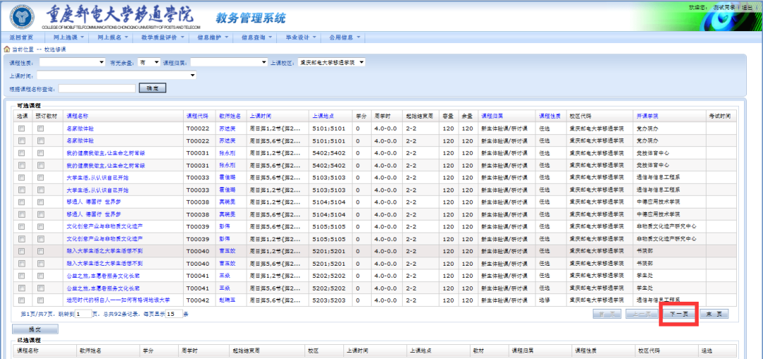 5. 出现课程列表,看看自己手上的《新生选课手册》,对照课程信息,新生体验课选课课号以“T”开头,新生研讨课选课课号以“Y”开头。查找自己之前确定要选的课程,注意看还有下一页。