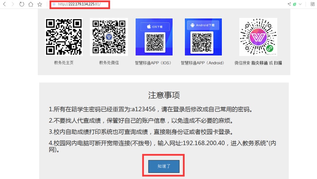 1. 登录教务网站ht tp://222.179.134.225:81/,倒计时结束后点击“知道了”。