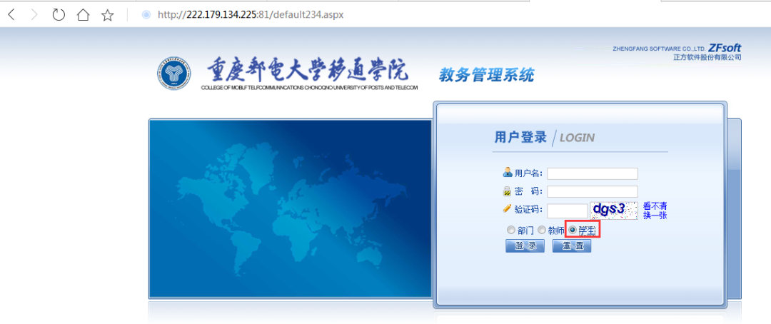2. 输入自己的“学号”和“密码”,密码一般默认是“a123456”。为保证账号安全,登录后立即修改并牢记密码。验证码下面栏选择“学生”,随后登录教务系统。
