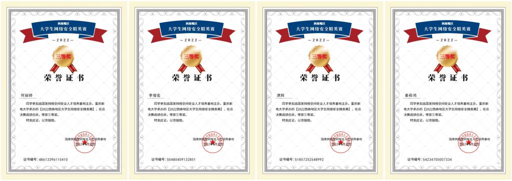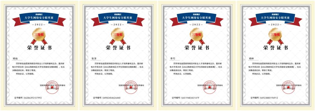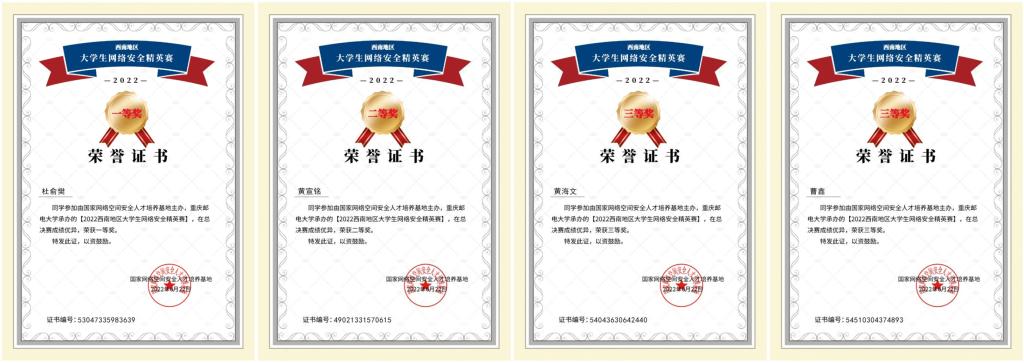 2022年6月由国家网络空间安全人才培养基地为主办单位,重庆邮电大学与网安世纪科技有限公司为承办方,协同释派电子科技(上海)有限公司联合举办的西南地区大学生网络安全精英赛圆满落幕。我校网络与信息管理中心崔向灵、张正梁、王庆老师指导的杜俞樊、黄海文、何丽婷、曹鑫等12位同学,在此次大赛中斩获一等奖在内的12枚奖项,均获得国赛资格。