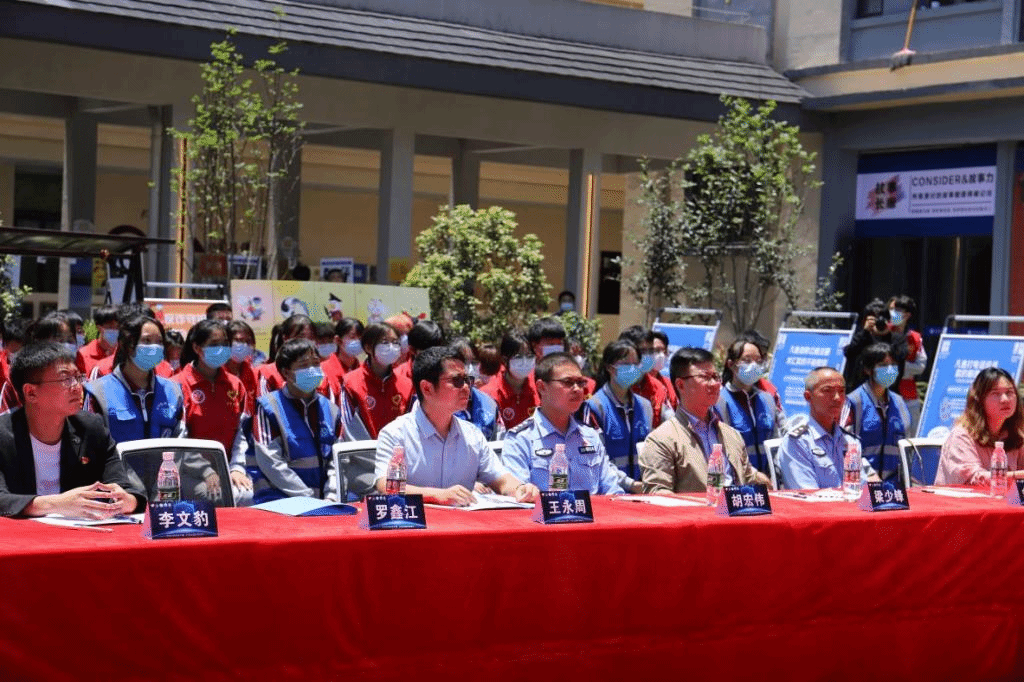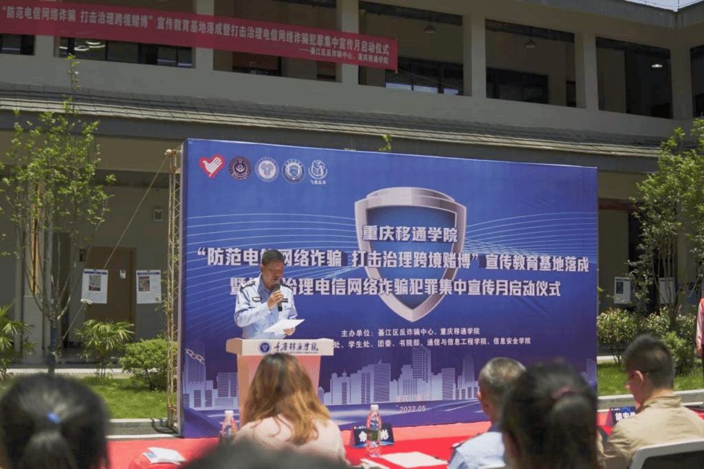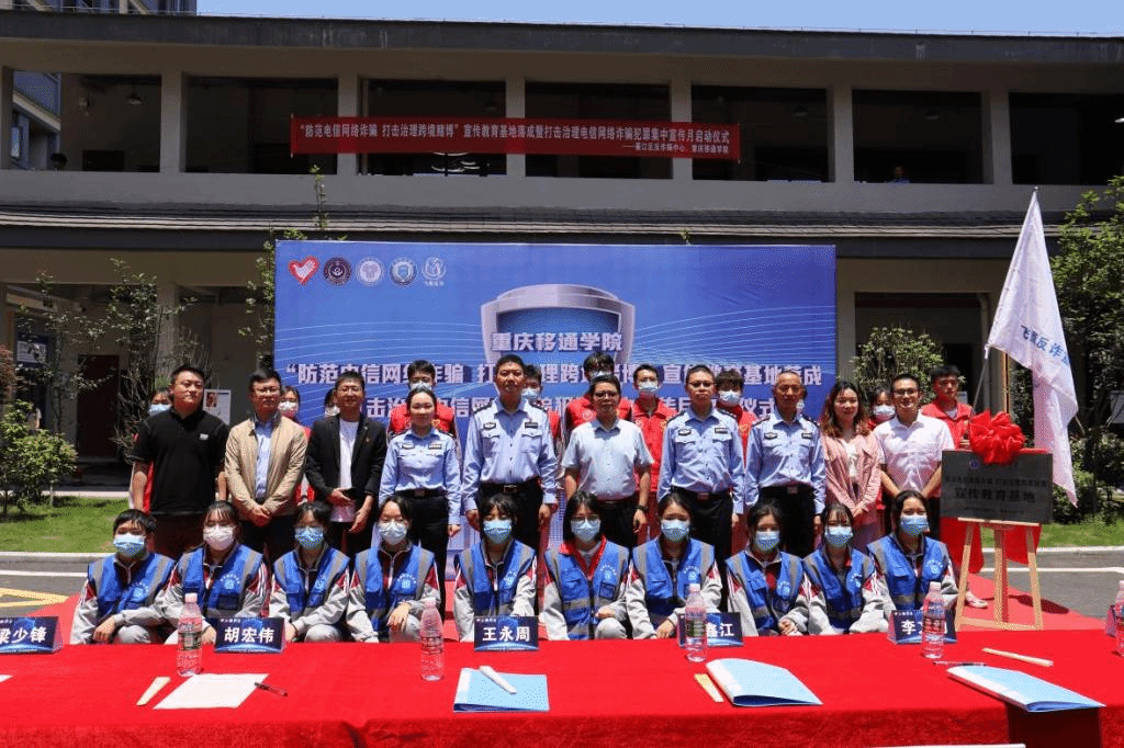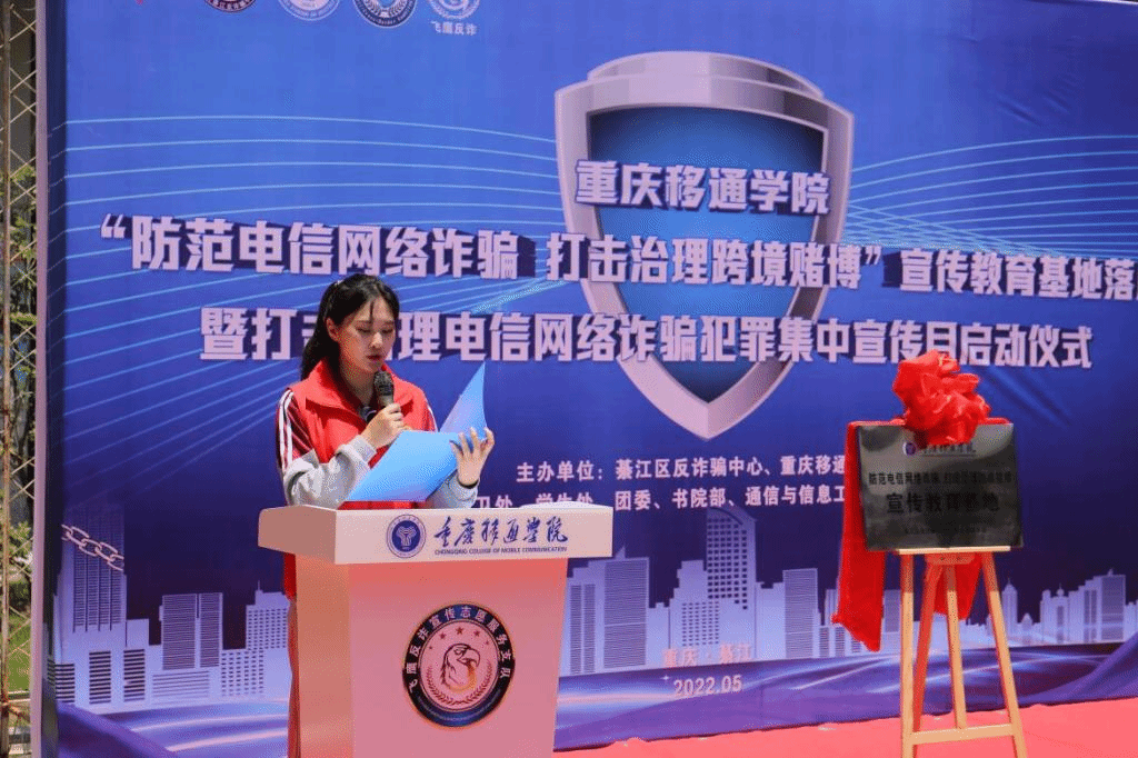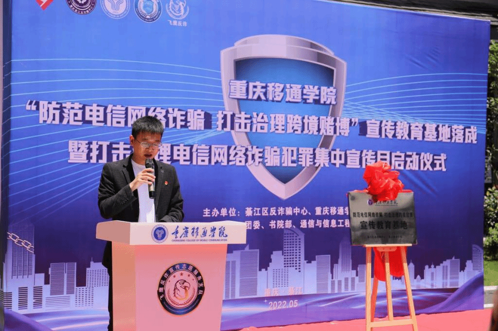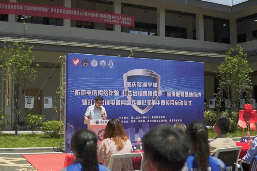 5月20日下午,在我校綦江校区綦河书院中庭举行了重庆移通学院反诈骗宣传教育基地落成暨校园反诈骗集中宣传月启动仪式。綦江区公安局副局长罗鑫江,綦江区公安局信息作战中心主任胡宏伟,綦江区公安局指挥中心主任陈静,綦江区通惠派出所所长余光彬,我校常务副校长王永周,副校长李文豹出席活动。綦江区公安局相关部门负责人,学校相关职能单位负责人,校区青联志愿者协会成员、“飞鹰”反诈骗专项志愿服务支队,班团支队成员共同参加了此次仪式。仪式由通信与信息工程学院、信息安全学院学工办主任周俊主持。