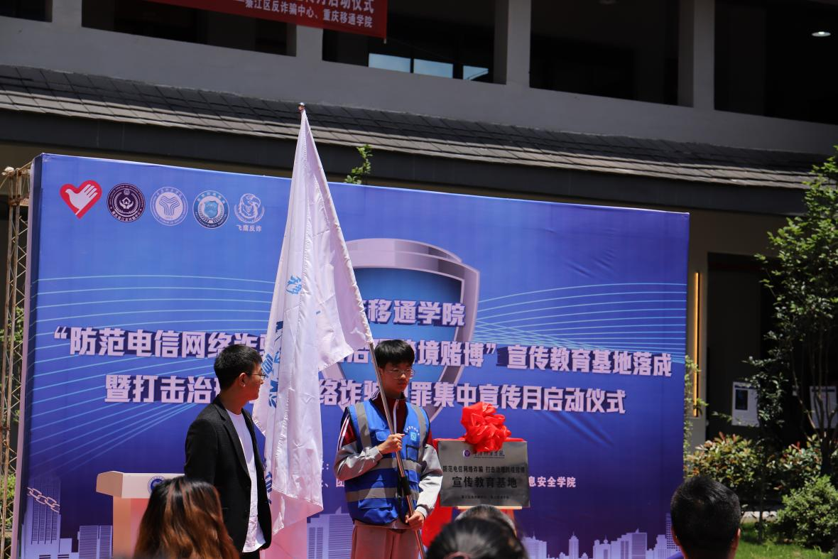 随后,副校长李文豹同志宣读《重庆移通学院关于成立校园反诈骗专项志愿服务支队的决定》并为专项志愿服务支队授旗。