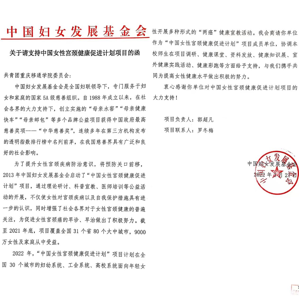 3月31日,我校团委收到来自中国妇女发展基金会发布的“关于请求支持中国女性宫颈癌健康促进计划项目的函”,我校正式成为中国妇女发展基金会“中国女性宫颈健康促进计划”项目成员单位!