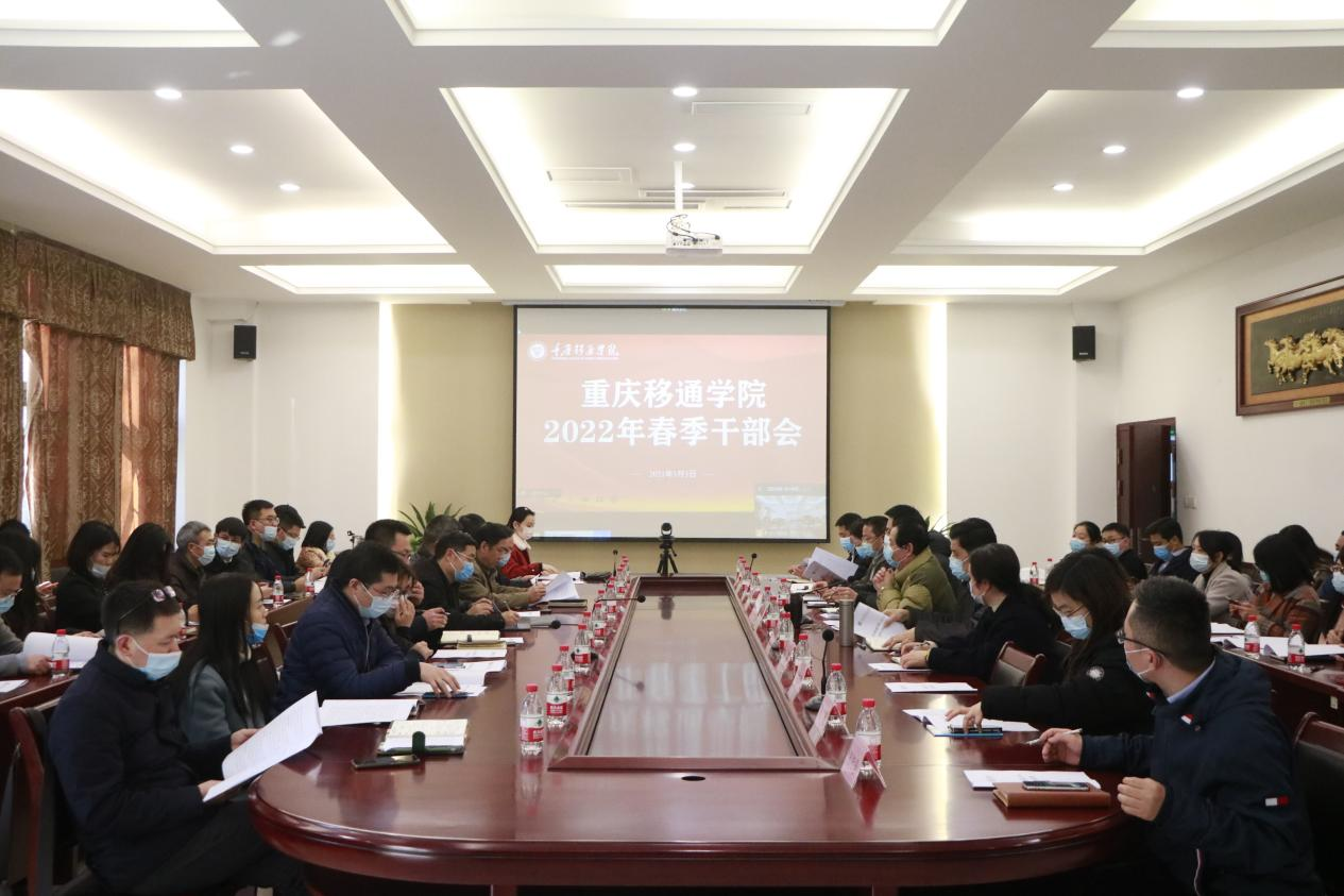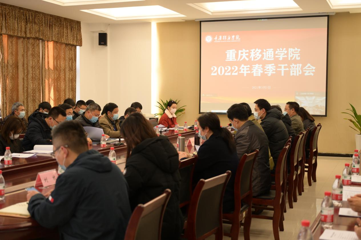 2022年春季干部大会在行政楼107会议室召开,会议总结2021年学校全年工作并部署2022年十项重点工作,会议同时在南湖书院及綦江校区设置分会场。校长张德民教授,党委书记苏开荣教授及全体在家校领导和科级以上干部参加会议。