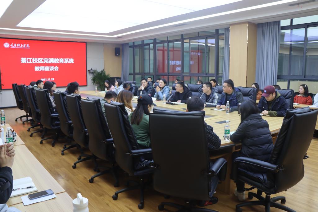 11月29日,綦江校区召开完满教育系统教师座谈会,教育集团执行董事、常务副总裁王征,副校长周伟、李文豹,双校区职能部门负责人、二级学院学工负责人及綦江校区完满教育系统全体教师参加了会议。座谈会由副校长李文豹主持。