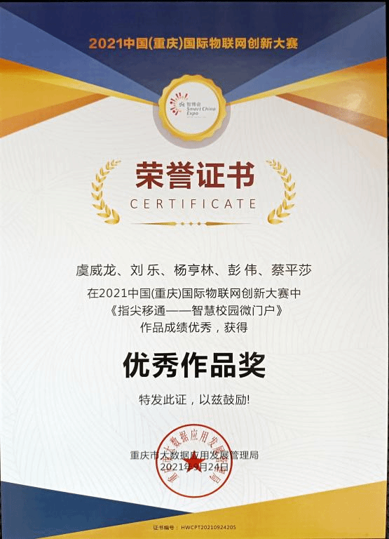 2021年6月由重庆市大数据发展管理局、重庆市经济与信息化委员会、重庆市教育委员会、重庆市科学技术局、重庆市渝北区人民政府、重庆邮电大学、华为技术有限公司等联合举办的国际物联网创新大赛圆满落幕。我校网络与信息管理中心吉腾渝老师、崔向灵老师指导的虞威龙、刘乐、杨亨林、蔡平莎四位同学组成的参赛队伍,在此次比赛中荣获优秀作品奖。