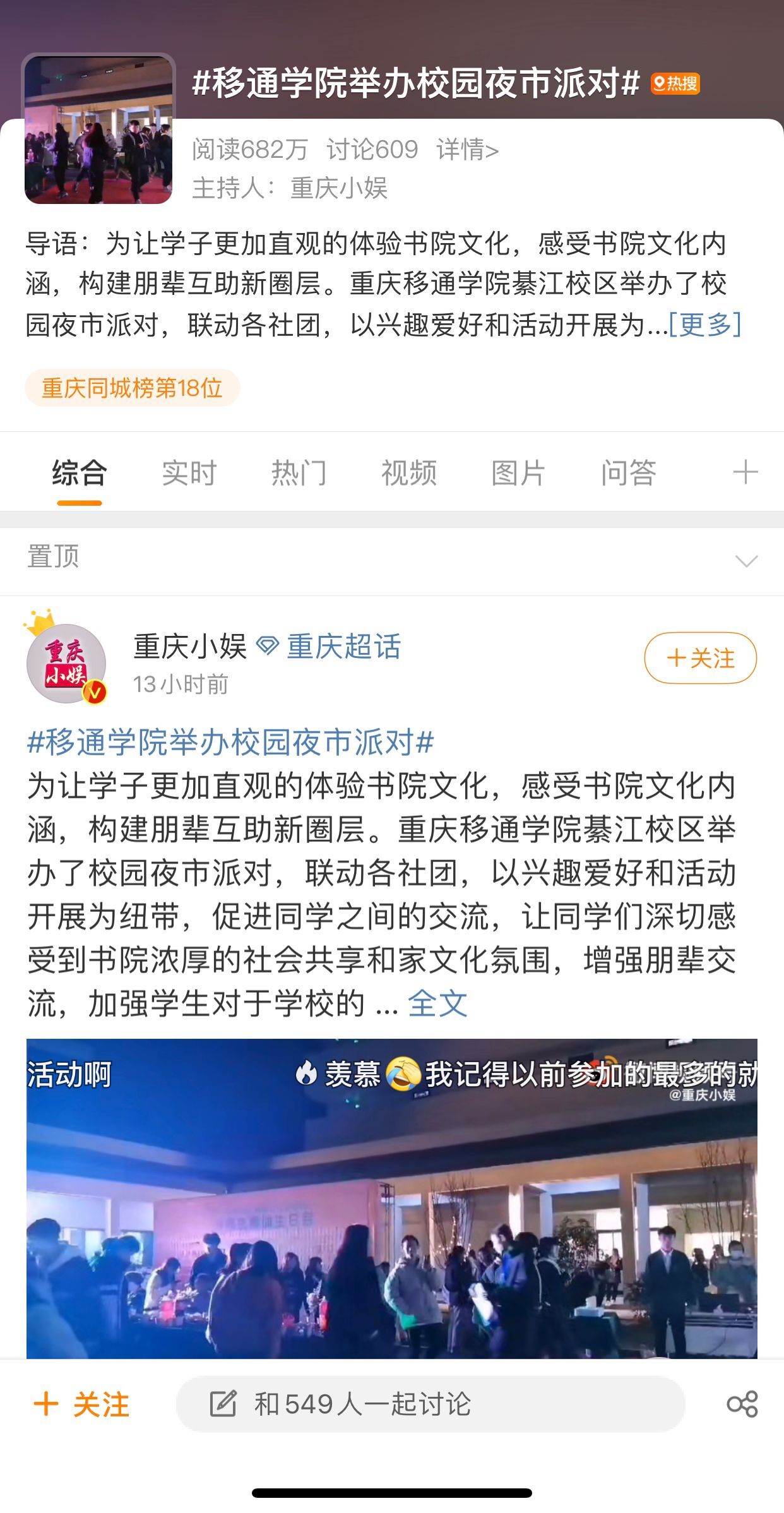 本次活动#移通学院举办校园夜市派对#话题,在新浪微博达到670万阅读量,占领同城热搜48小时,两千余师生,共同点燃移通之夜。