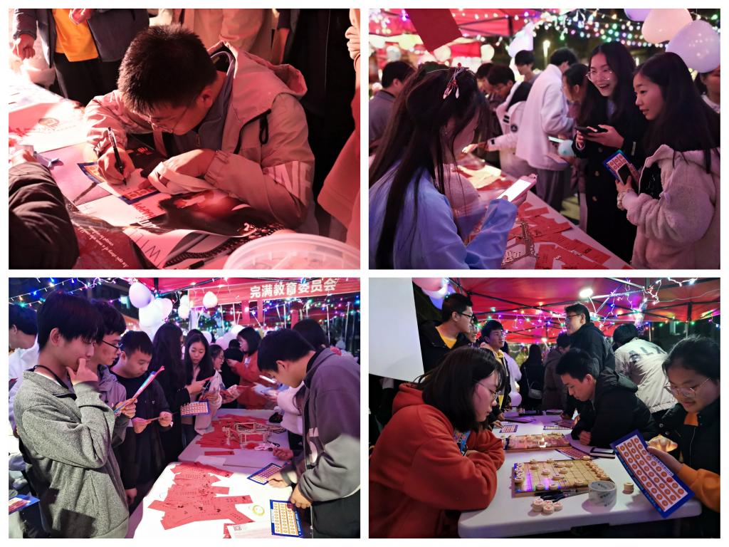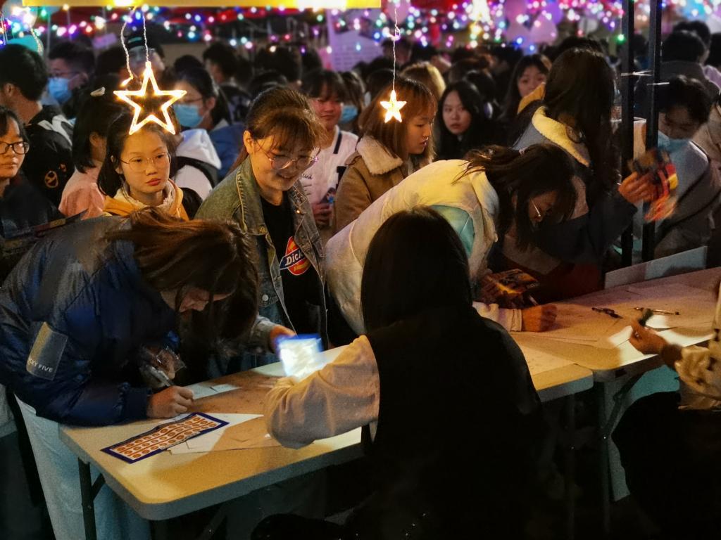 綦河书院专属帆布袋DIY使学子们在欢乐中学会创造,在创造中感悟生活。不要做挑战,头脑大battle、答非所问、拼汉字以及真假难辨则是才思能力的发挥,逆向思维,逻辑推理能力、问题应对能力、结构化思维以及判断能力在这些小游戏中不经意便透露了出来,玩乐中学习,玩乐中收获,这便是夜市娱乐的独特风采。山间风,水边风,负笈求学脚下风,风吹浮萍有相逢,“缘来是你”以及踩气球活动的一男一女奇特风格,吹出了相逢的美好,踩气球带来两人竞争的欢快相逢,而“缘来是你”则促使了明月朗朗,清风习习,对坐两人,心有灵犀的美好相遇,既有相逢何不一起玩乐,蔬菜大连蹲、叠报纸、你画我猜加深相逢的感情,于游戏中收获欢乐,合作中收获友谊,这正是学院朋辈文化的传承,朋辈文化的延续,加强同学之间凝聚力,加深学生对学院归属感,而文化夜市,热闹非凡,撑得起一轮月色,偶然相逢,欢快合作,亦带得回几颗暖心。