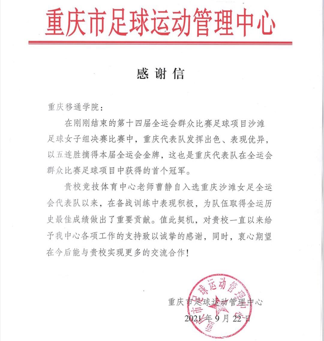 曹静老师在赛后也发表了夺冠感想,她表示,非常感谢学校领导的大力支持,能够有机会参与这次赛事并获得奖项,很荣幸能够为学校争光添彩。22日时重庆市足球运动管理中心还给我校送来了一封感谢信。
