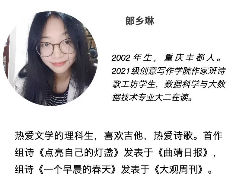 诗歌工坊学生 陈宏鹏:郎乡琳的诗歌特别富有灵性。她的诗歌营造出的意境会让读者情不自禁地想象相似的画面,画面中的人物形象跃然纸上。在她的诗歌语言中充满了童真般透视的视角与表达,对文字的打磨反映在她诗歌作品的特异性表达中。