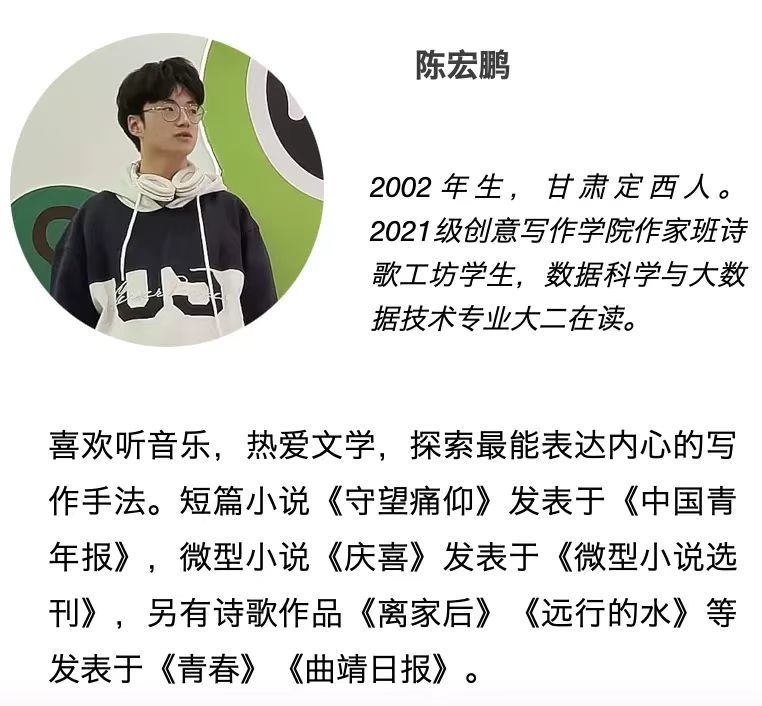 陈宏鹏同学在写作上全方位的发展,小说、散文、诗歌,用现在的网络热词形容就是六边形战士。应该是上了大学就很少回家,通过诗词的方式来表达对家乡的思念,诗词整体给我的感受是孤寂,让我印象深刻的是远行的水诗词集中《存在》中的曾有流浪者、现在只剩遗落的瓶子,有种孤零零的没落感。还有《凌晨的校园》中清冷的灯光、远行的寂寞,笔下的景象中都直观透露出孤独感。