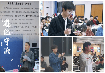 紧接着,号召同学们签订大学生“遵纪守法”承诺书,作为对自己的一个承诺,严格遵守法律法规,争做有理想、敢担当、能吃苦、肯奋斗的新时代好青年。