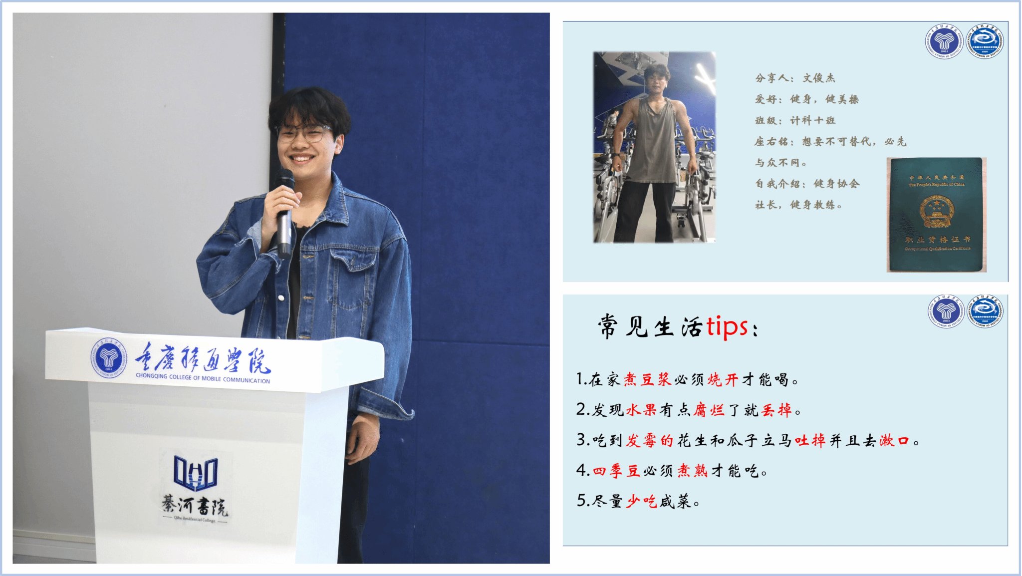 计科10班文俊杰同学,以作为一个健身教练的经验,包括自己平时的饮食习惯、作息规律、锻炼频次等,呼吁同学们健康生活,并向同学们讲解了生活中常见的有毒食物、相克食物,以此让同学们注重饮食健康。与此同时,还结合了电视剧《卿卿日常》中具体的例子,向同学们科普了甲鱼和苋菜相克的例子。