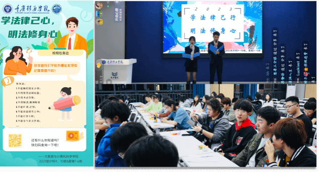 为推进法制教育,增强学生的法治意识、自我保护意识,引领广大学生学法、知法、守法。3月22日19:30,大数据与计算机科学学院计算机科学与技术专业10班在綦河书院2号楼观涛·多功能报告厅(QH2222)组织开展了年级会。