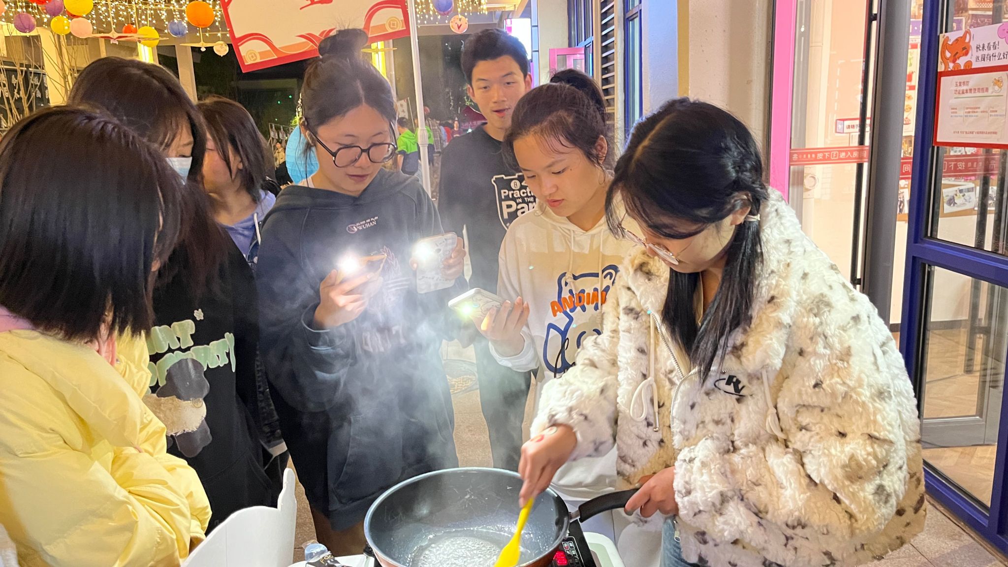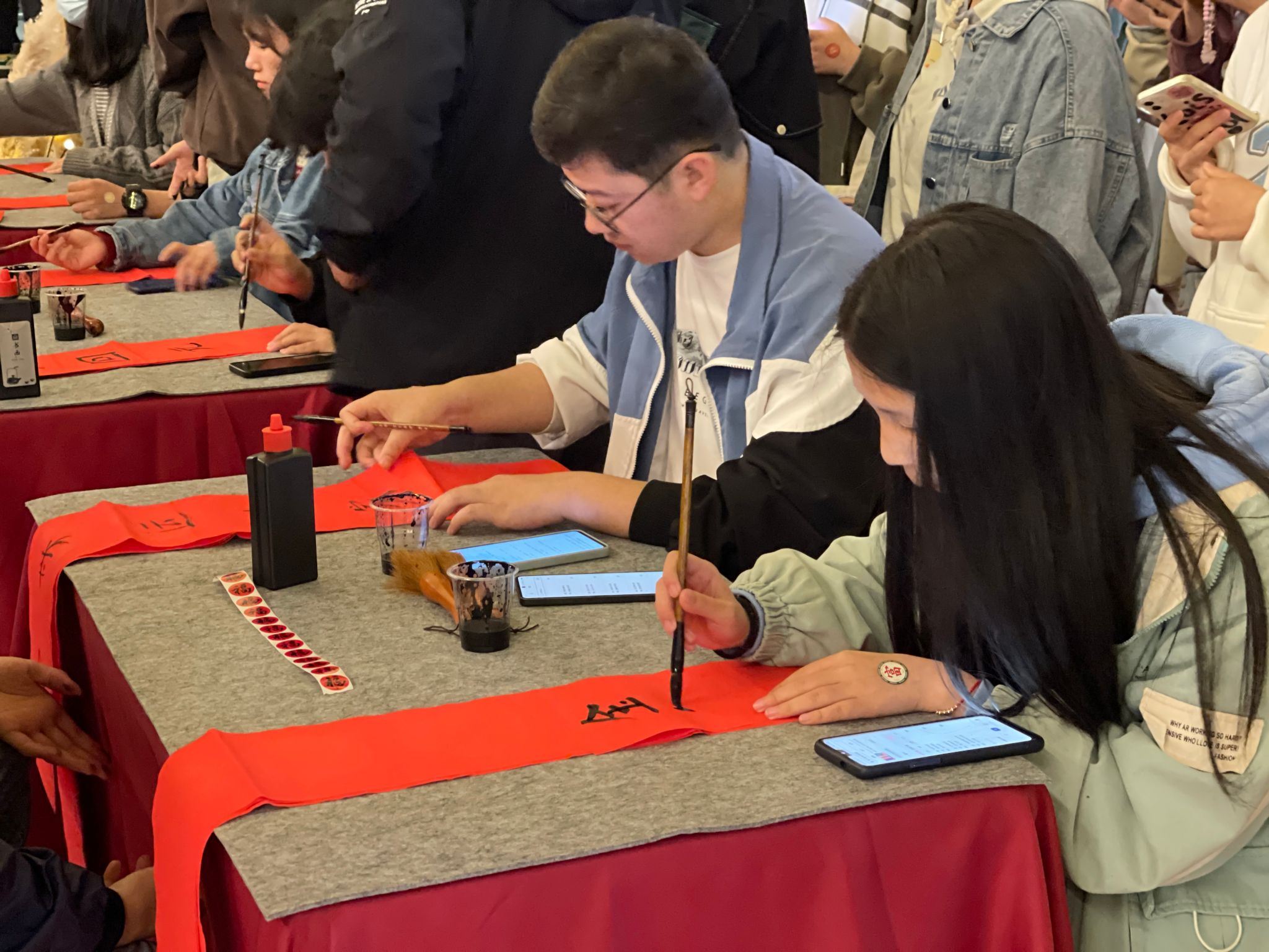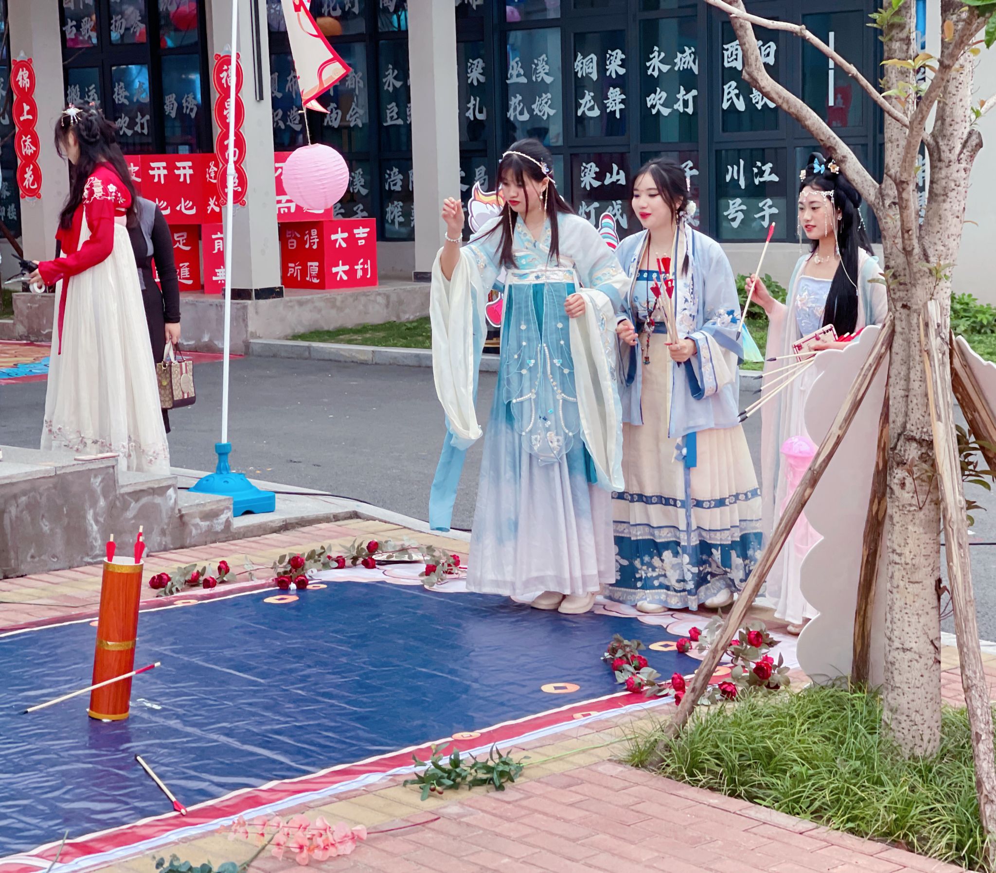 花灯如昼今宵夜,灯火阑珊人长久。学子们或提灯夜游,穿梭于大棠夜巷;或三五成群,驻足于灯海之下;或提笔蘸墨,书写古韵古意。飞花令上,谈者爱好诗词歌赋,共同咬文嚼字;灯谜上竞者激情澎湃,争抢作答,还有投壶、放花灯、系红绸等多元的传统文化互动环节临街而设,让学子们梦回大唐,感受古代文人墨客的乐趣。